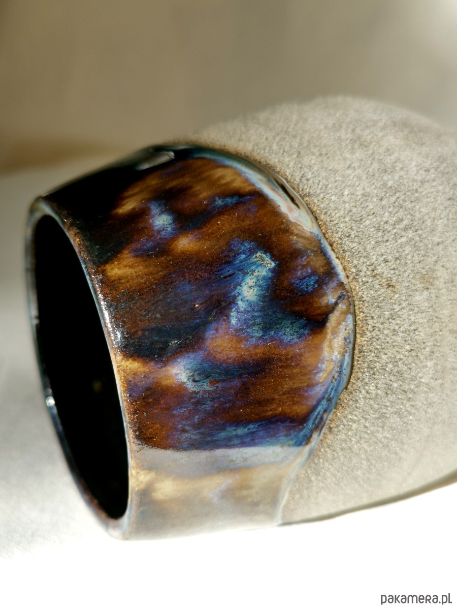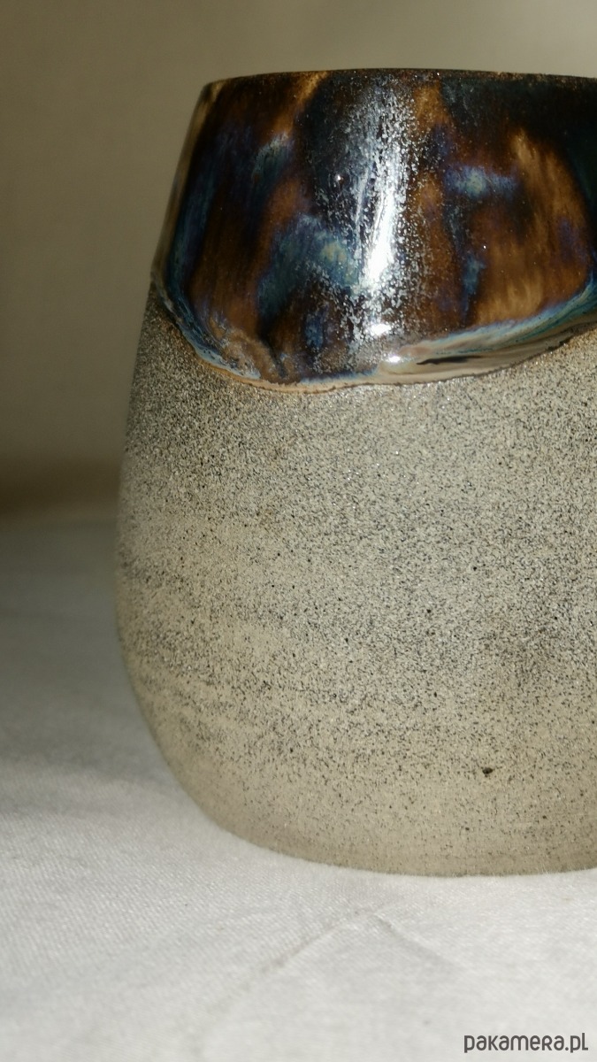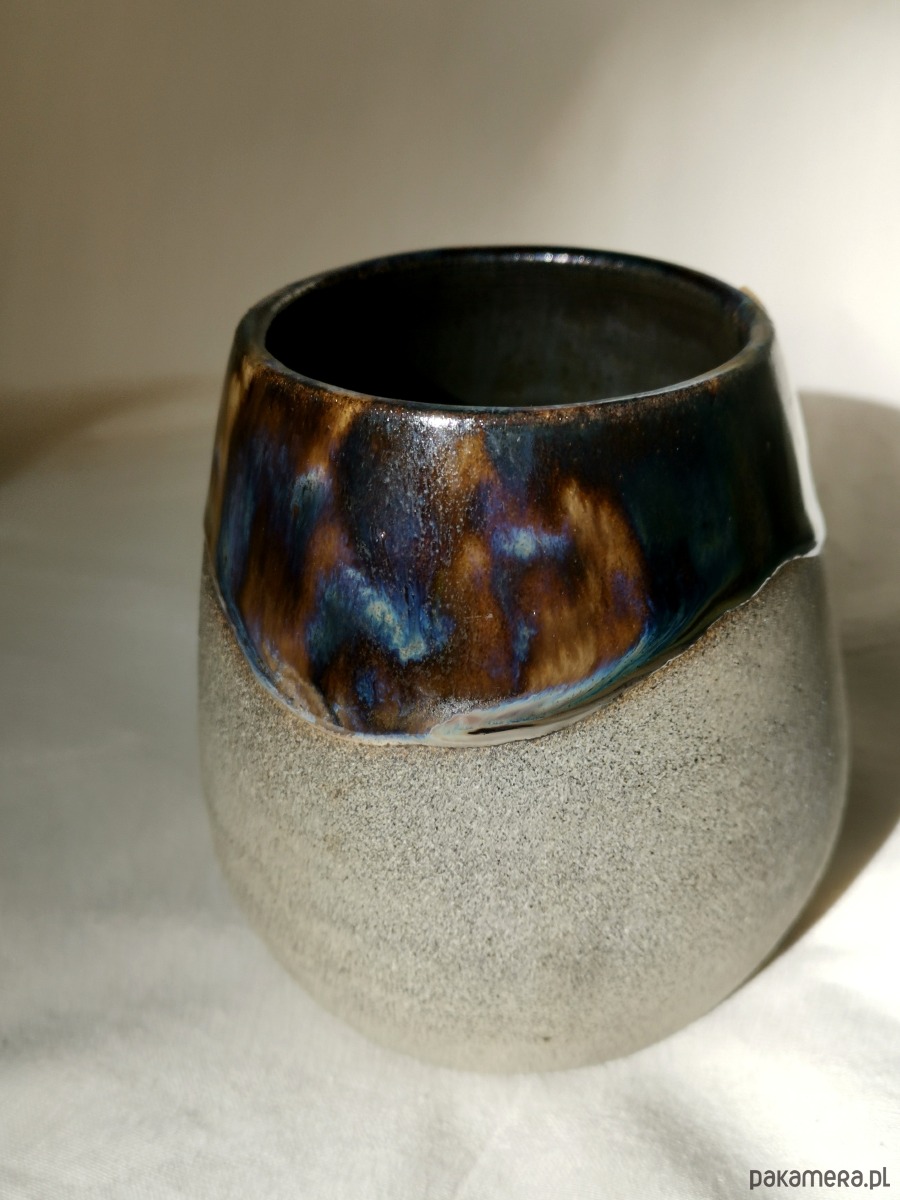 Szkliwo w odcieniach brązu i granatu przechodzi w surową, betonową glinę – prostota i natura w jednym przedmiocie.