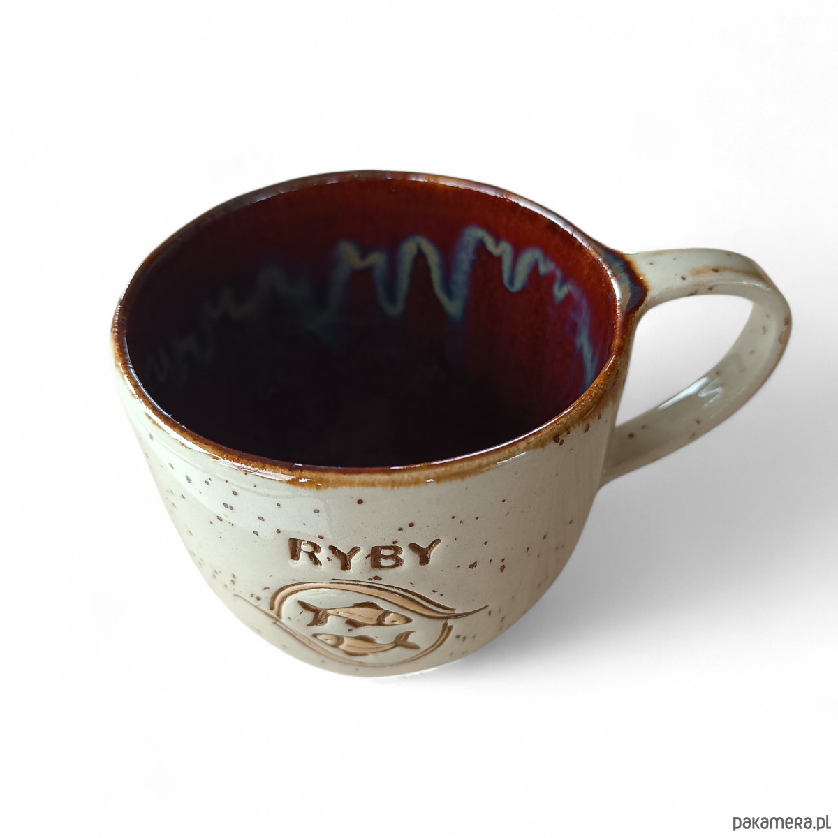Ceramiczny kubek, ręcznie robiony i szkliwiony.