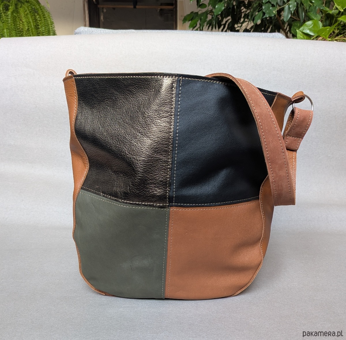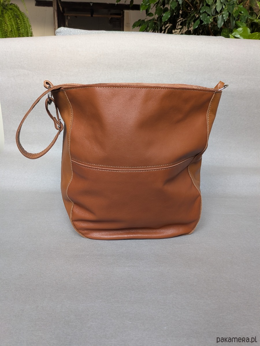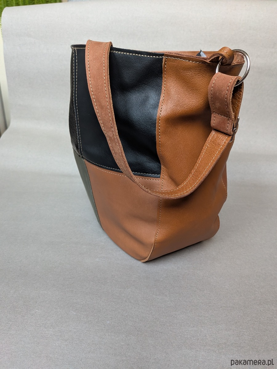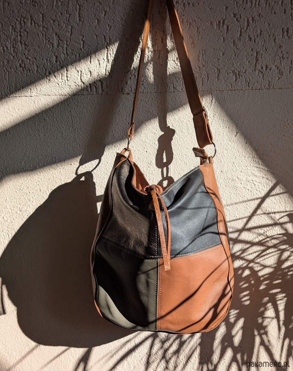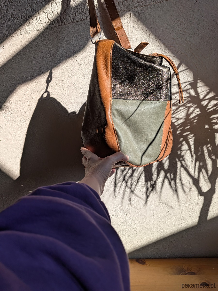 Kubełek Skórzana torba w kolorach koniaku złota i zieleni
