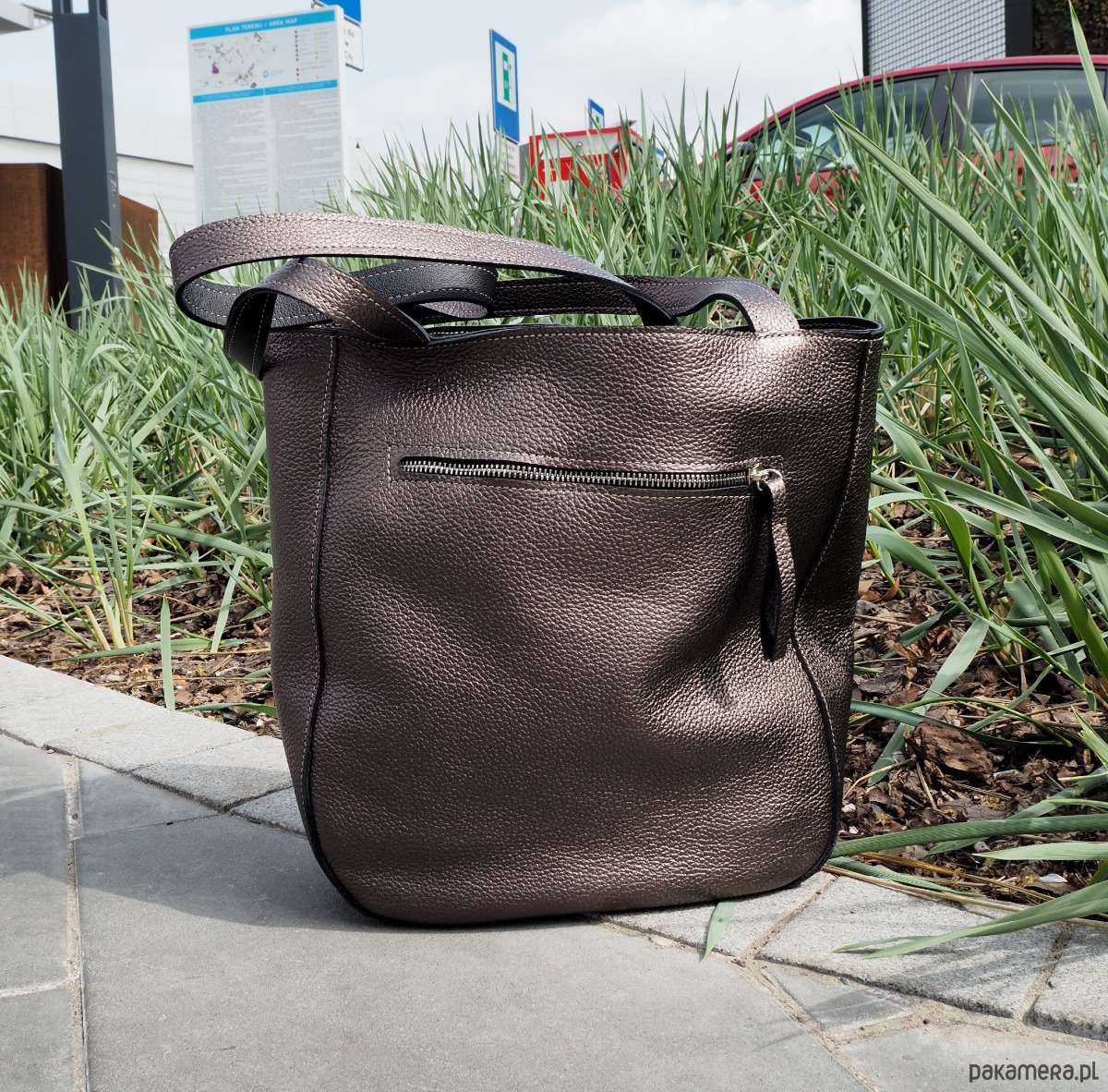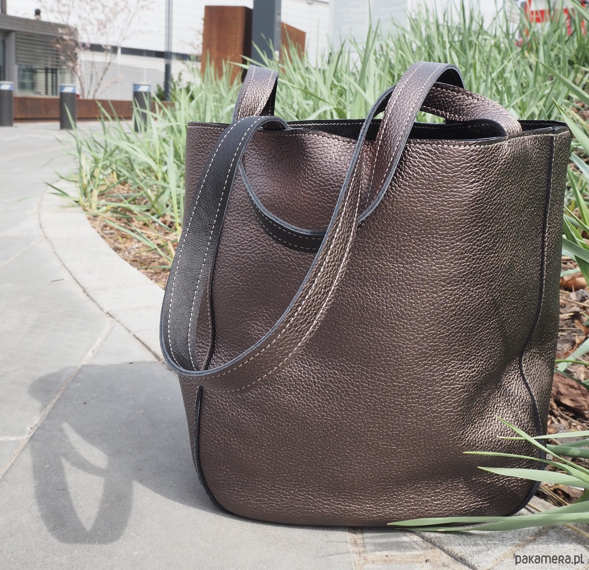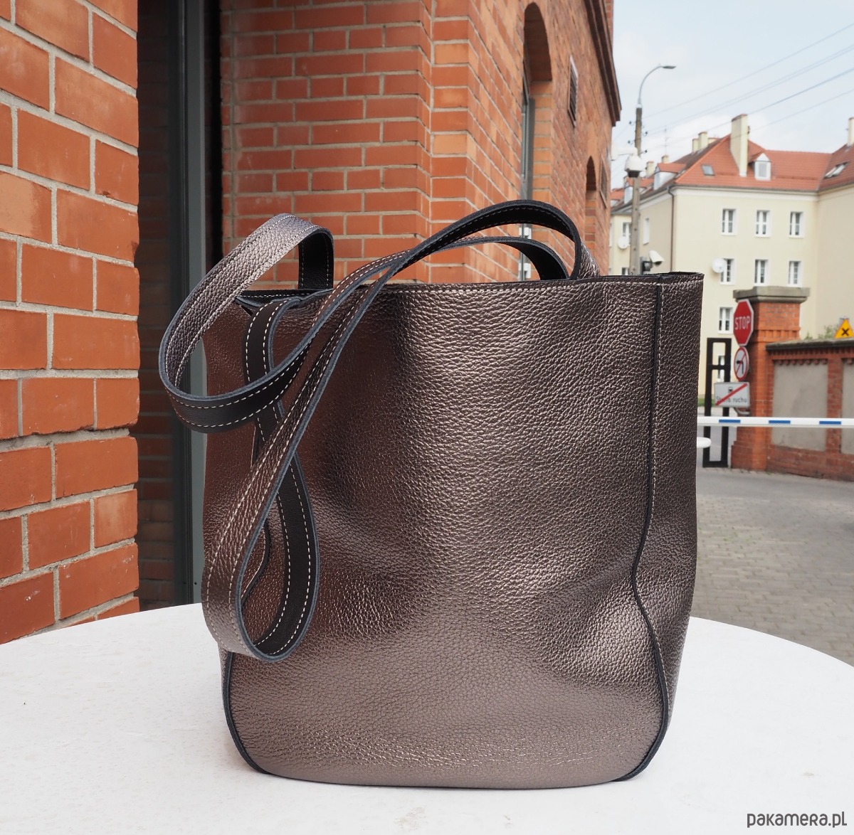 Uszyta z przepięknej skóry naturalnej w kolorze ciemno złotym. Skóra miękka, elastyczna, choć nie jest bardzo wiotka. Torebka fajnie trzyma kształt takiego wiaderka.