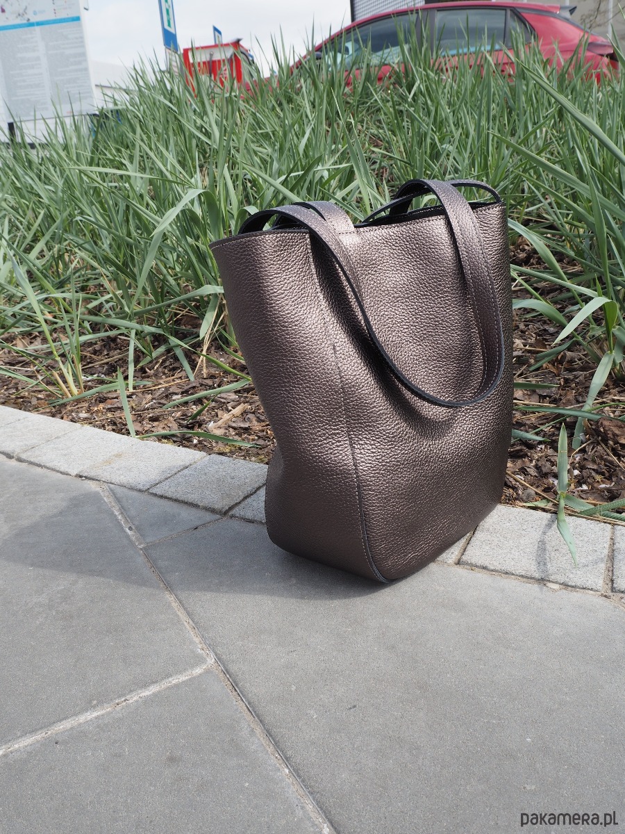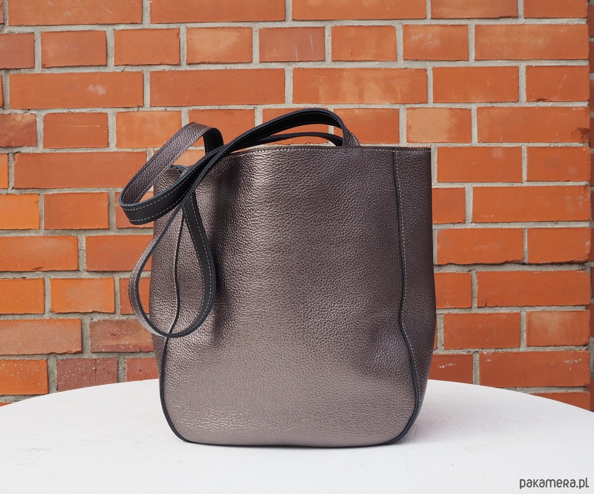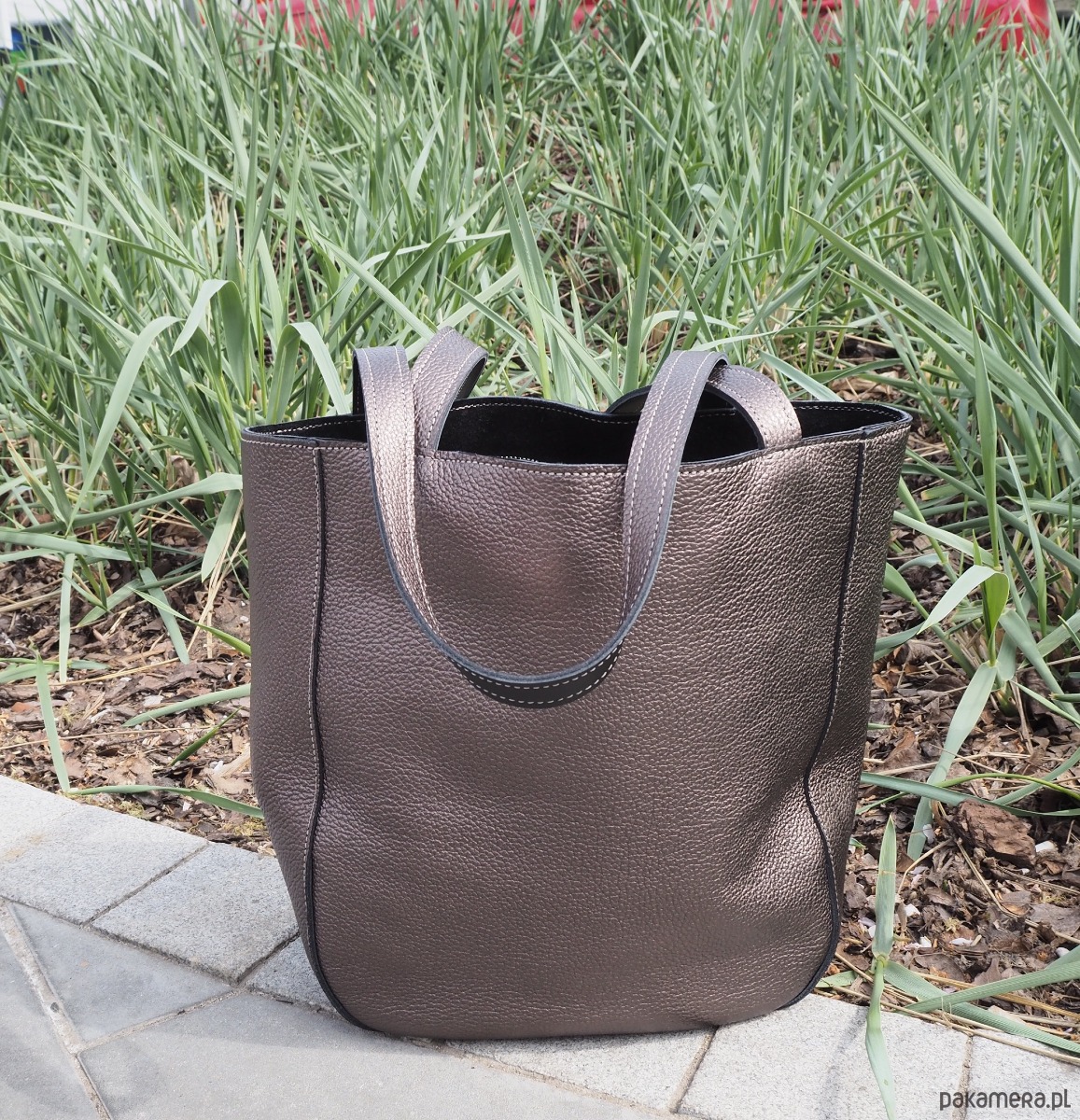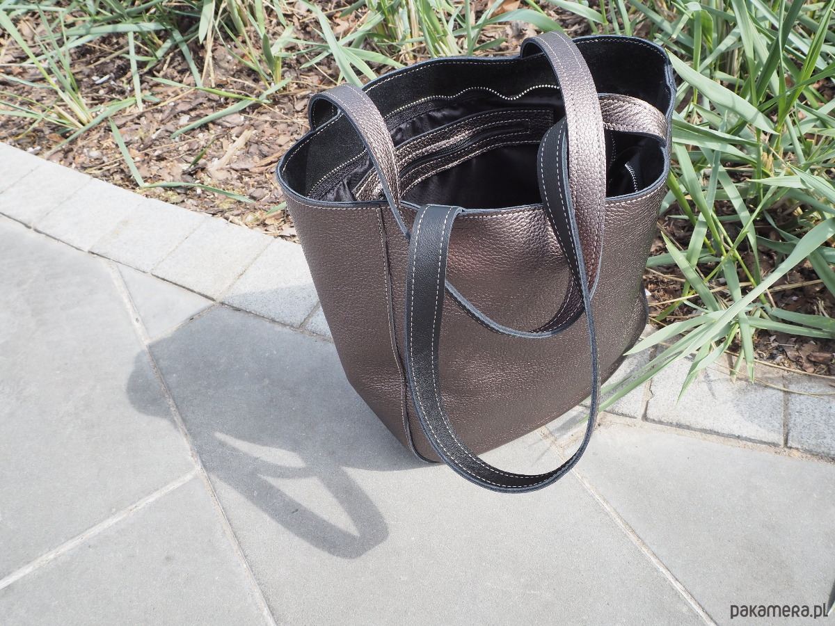 Uszyta z przepięknej skóry naturalnej w kolorze ciemno złotym. Skóra miękka, elastyczna, choć nie jest bardzo wiotka. Torebka fajnie trzyma kształt takiego wiaderka.