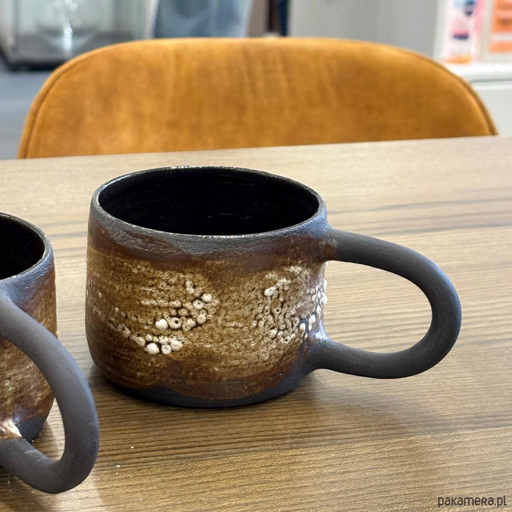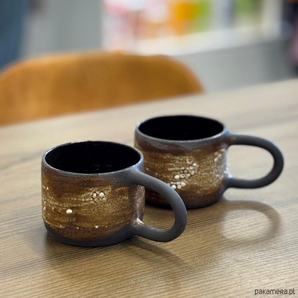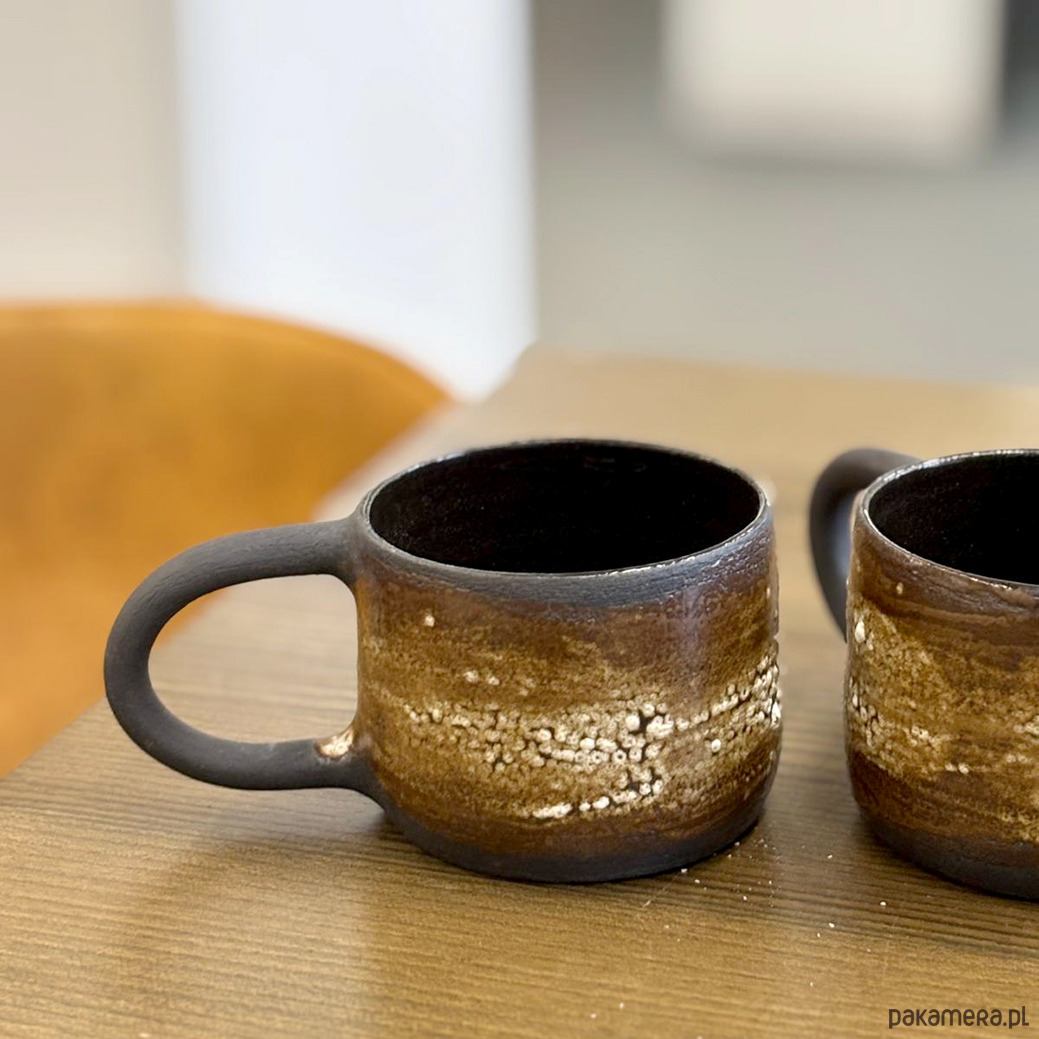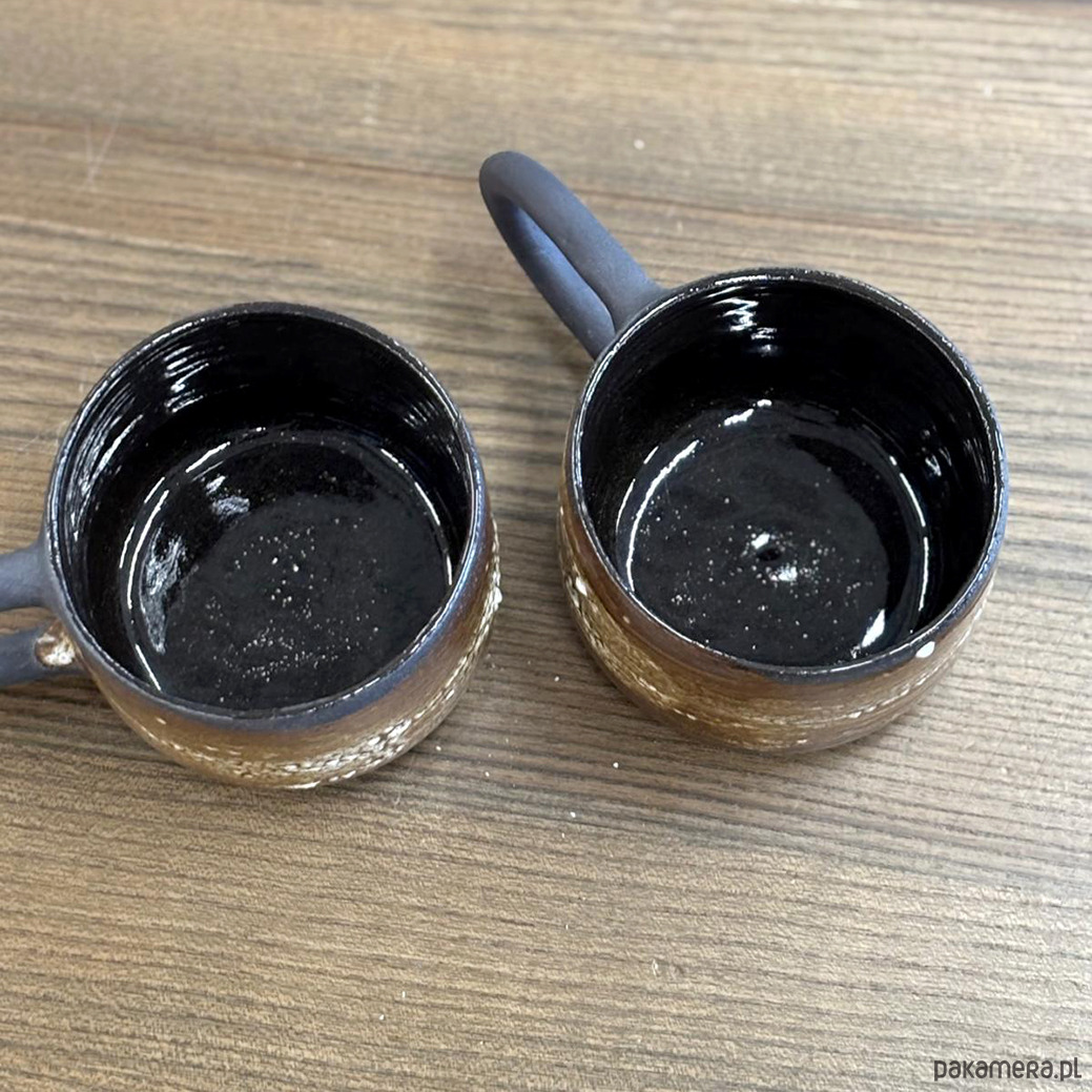 Kubki lepione ręcznie na kole z brązowej gliny. Pokryte bardzo ciekawym jasnym szkliwem.