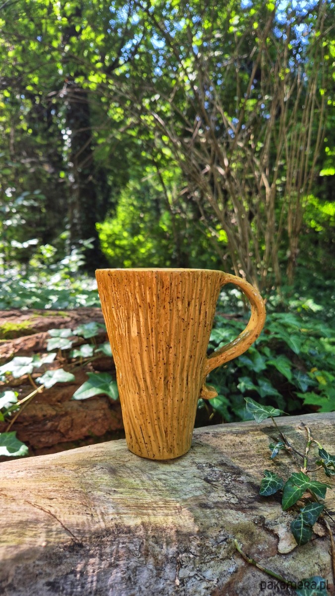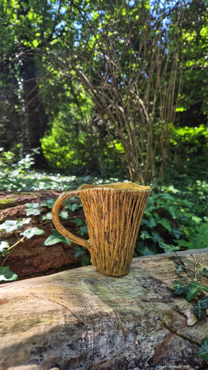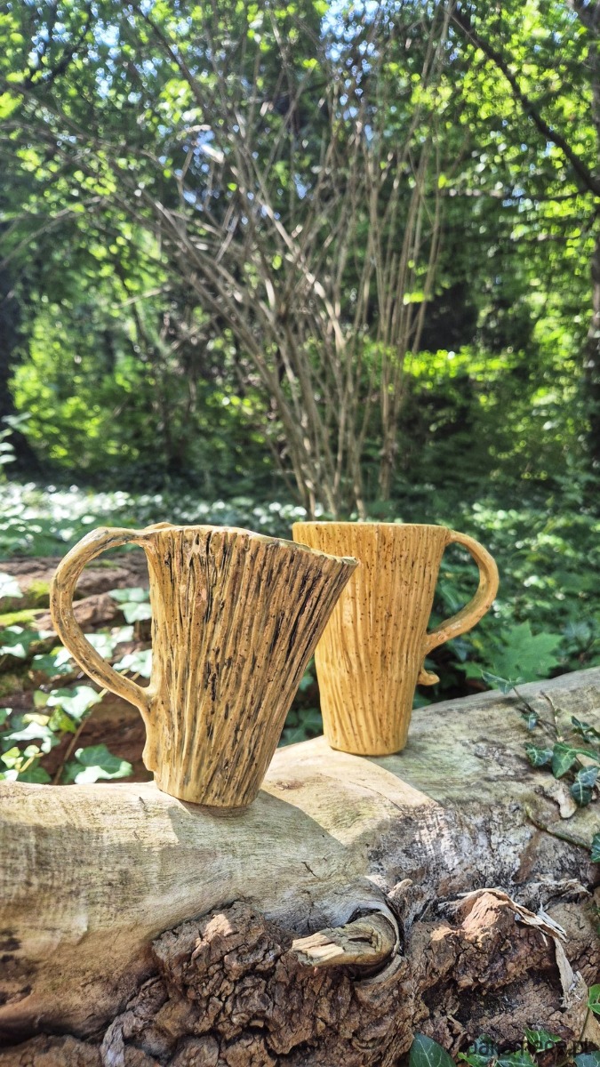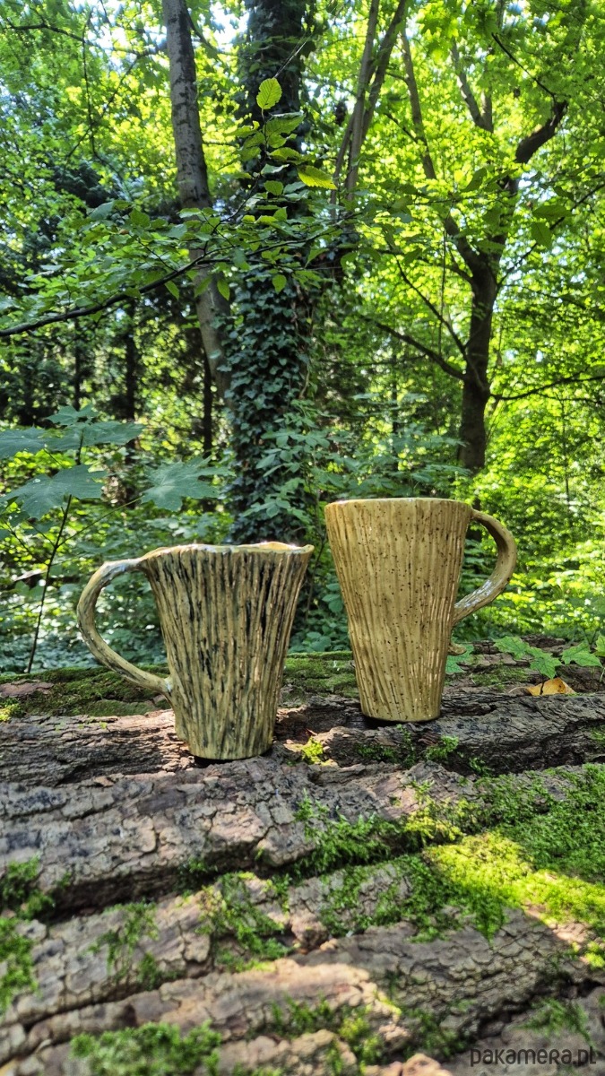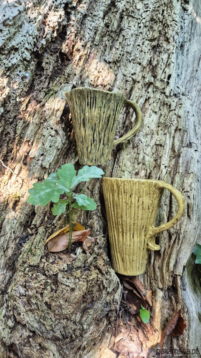 Unikatowe kubki ceramiczne, ręcznie toczone na kole garncarskim. Ich powierzchnia została ozdobiona rzeźbionym reliefem, który przywodzi na myśl naturalną fakturę drewna i leśnych grzybów.