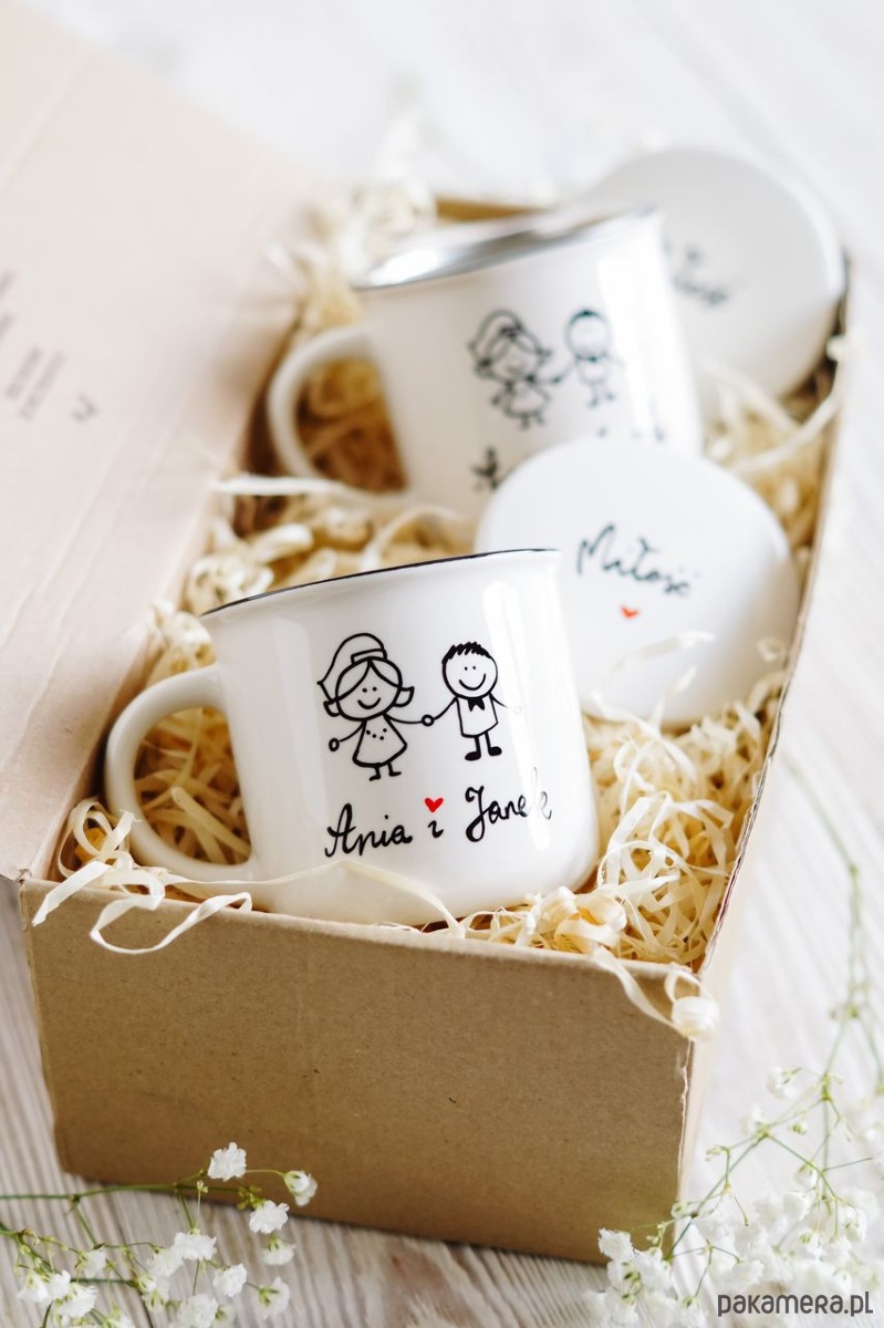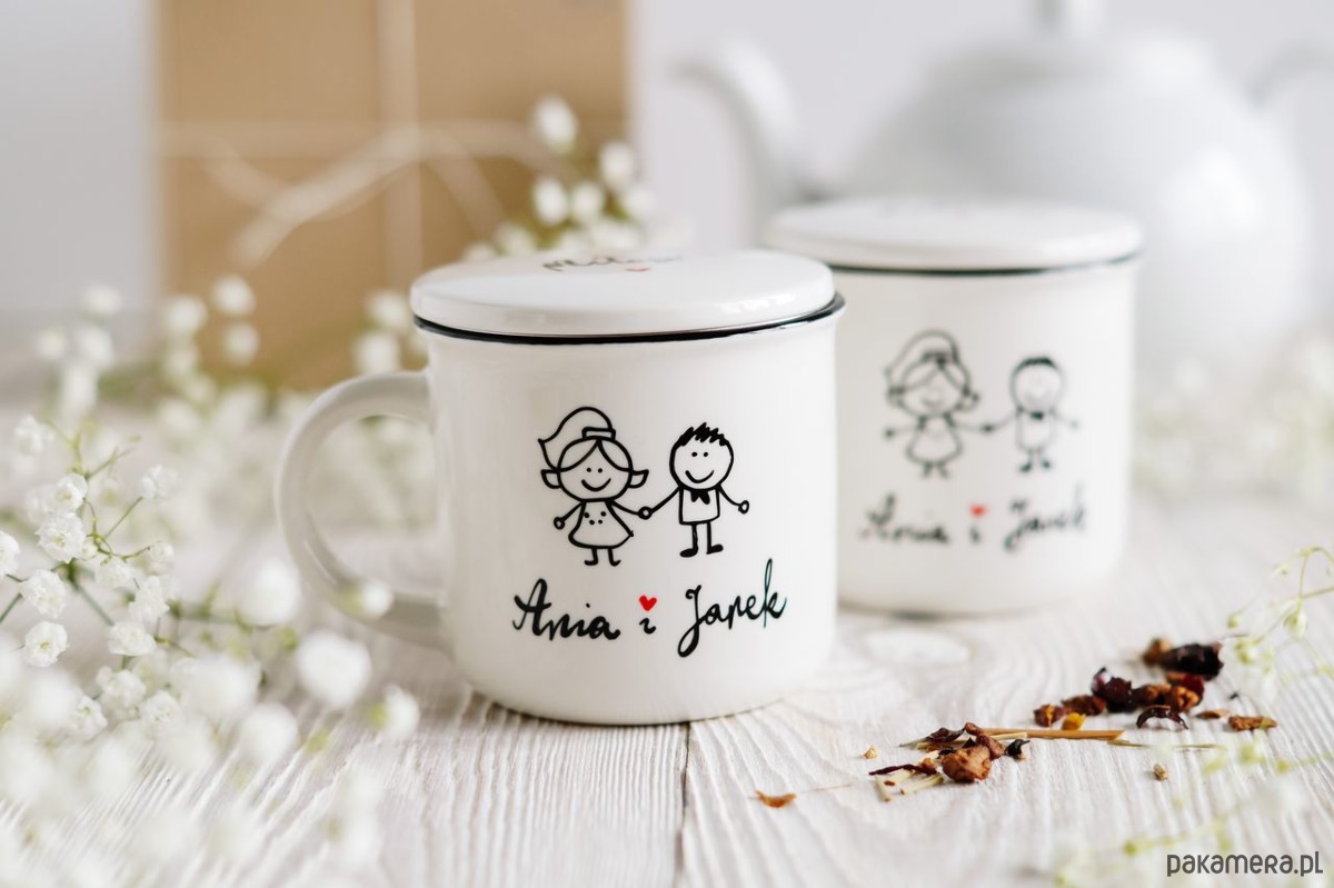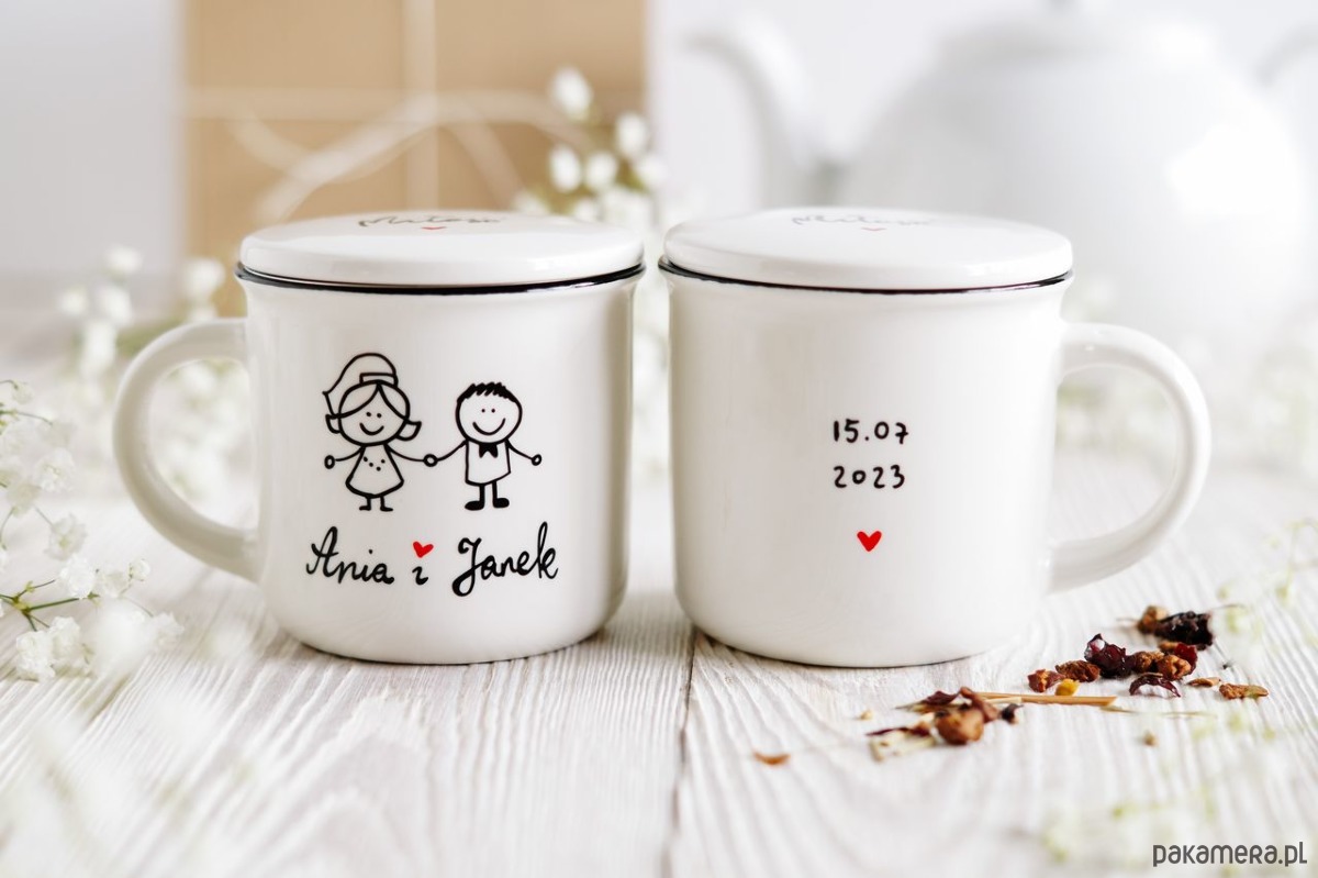 Kubki Młodej Pary personalizowanie imionami i datą polecają się jako niewiędnąca pamiątka z okazji ślubu lub rocznicy.