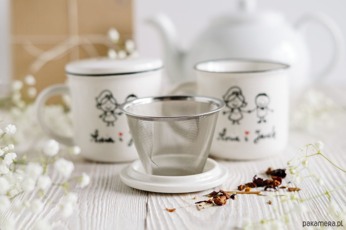 W zestawie 2 kubki ceramiczne z czarnymi rantami, pojemność 300 ml, wys. 8 cm, średnica 9 cm. 2 pokrywki ceramiczne i 2 metalowe sitka.