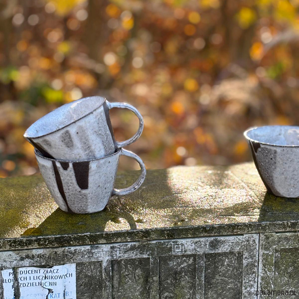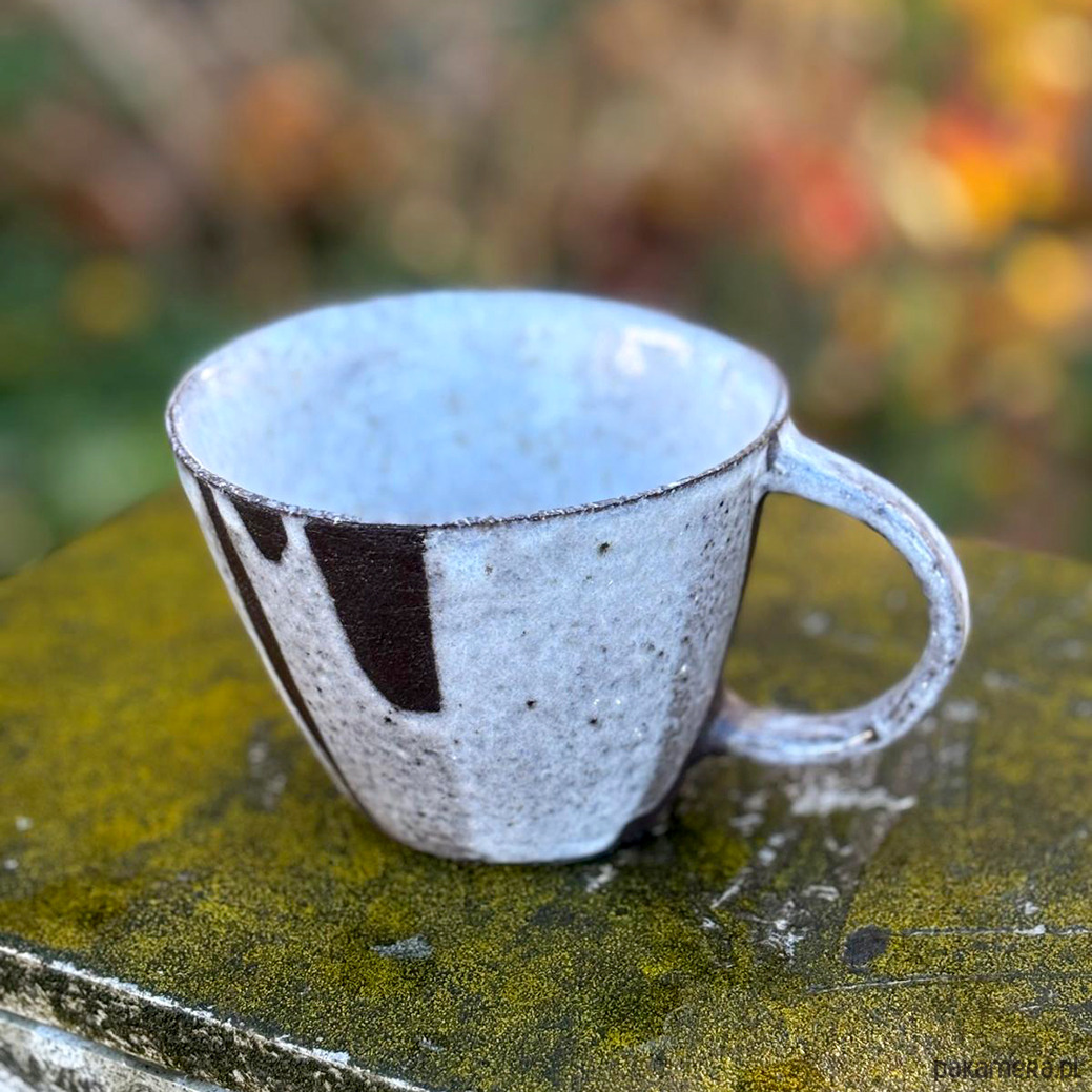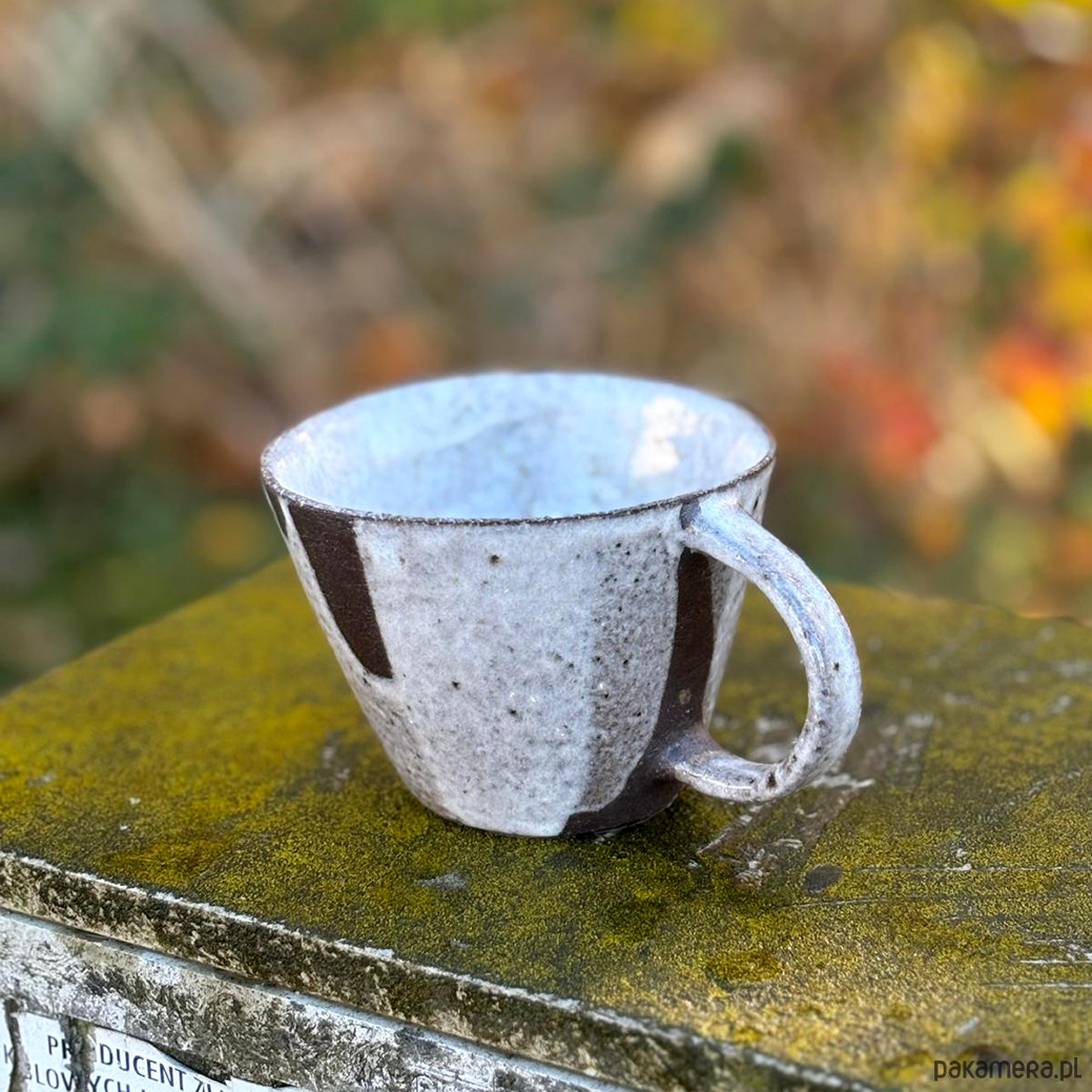 Duży, pojemny, kształtny, lejkowaty, rustykalny kubek z uchem.