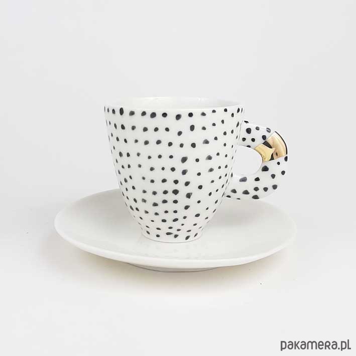 Filiżanka espresso z uchem, wykonana z cienkościennej porcelany. Wysokość 5,5cm, pojemność 70ml. Filiżanka szkliwiona obustronnie szkliwem bezbarwnym. Dekoracja wykonana ręcznie techniką podszkliwną. Uszko dekorowane 11% złotem. Filiżanka nadaje się do zmywania w zmywarkach.