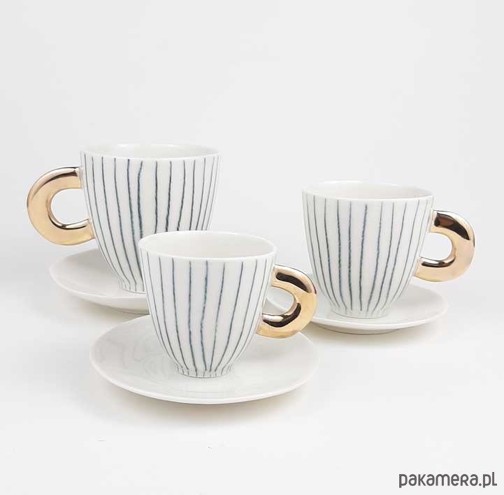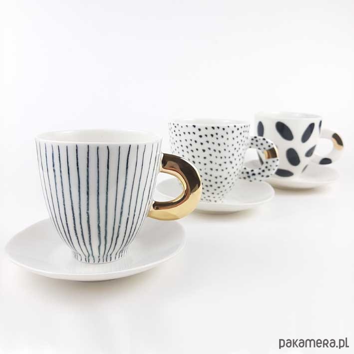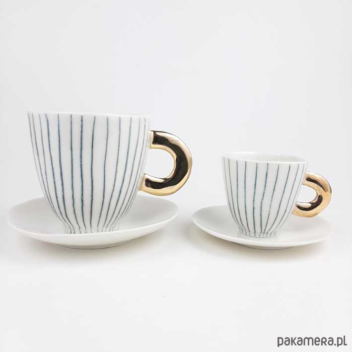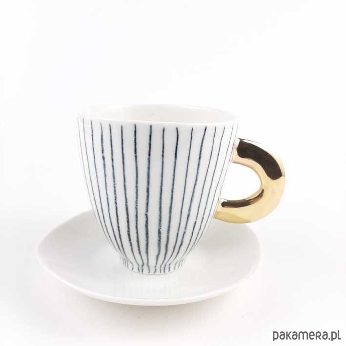 Filiżanka do herbaty z uchem, wykonana z cienkościennej porcelany. Wysokość 8cm, pojemność 220ml, średnica spodka 12,5cm. Filiżanka szkliwiona obustronnie szkliwem bezbarwnym. Dekoracja wykonana ręcznie techniką podszkliwną. Uszko dekorowane 11% złotem. Filiżanka nadaje się do zmywania w zmywarkach.
