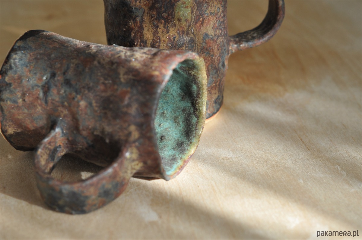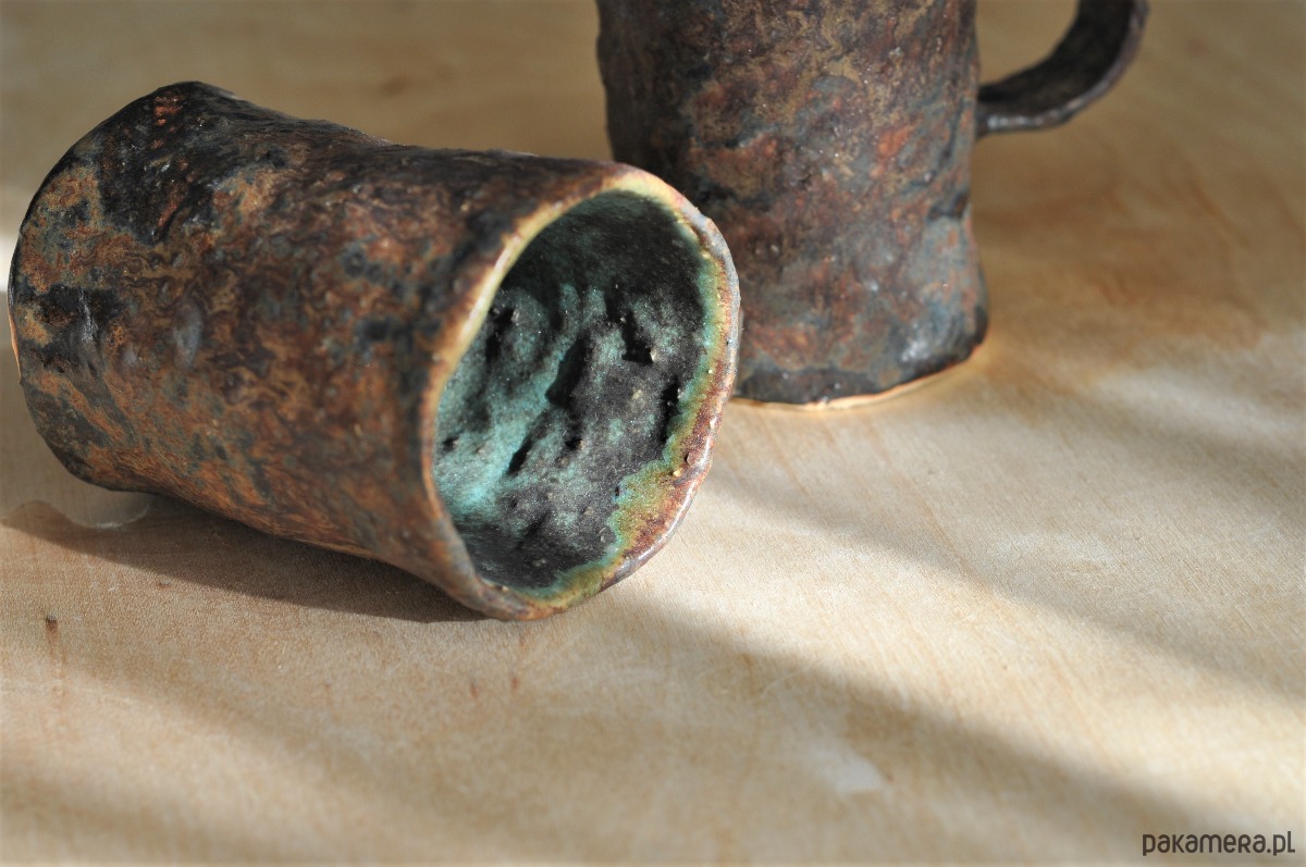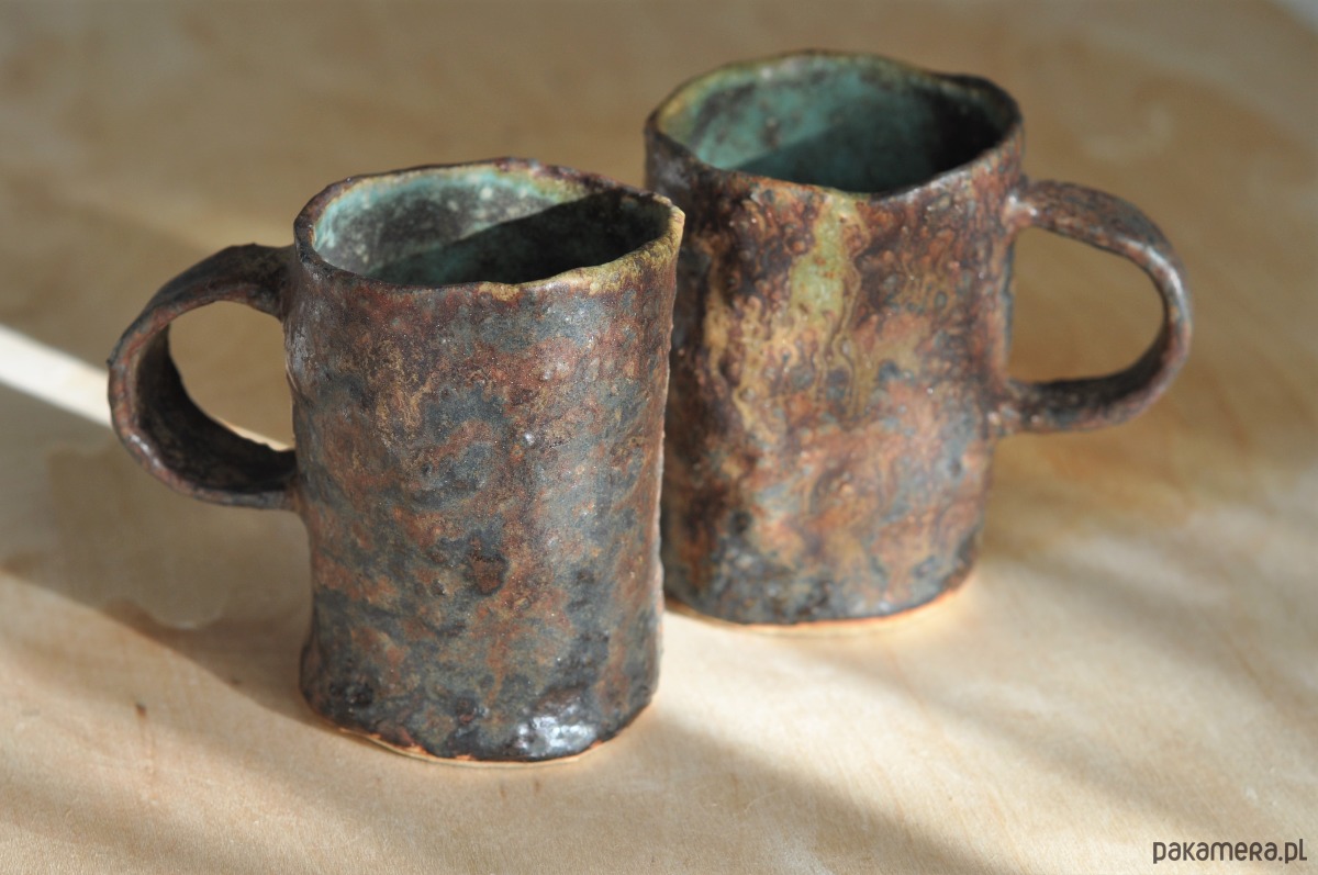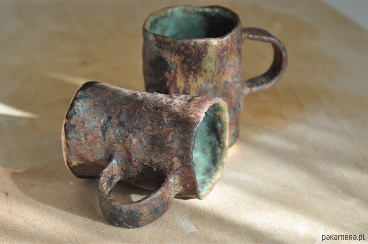 Komplet dwóch, ręcznie robionych filiżanek do kawy w kolorach ciemnego brązu i przebarwianej na ciemno zieleni. Matowe. Dzięki nieregularności kształtu fantastycznie prezentują się na stole, zawsze przyciągają uwagę.
