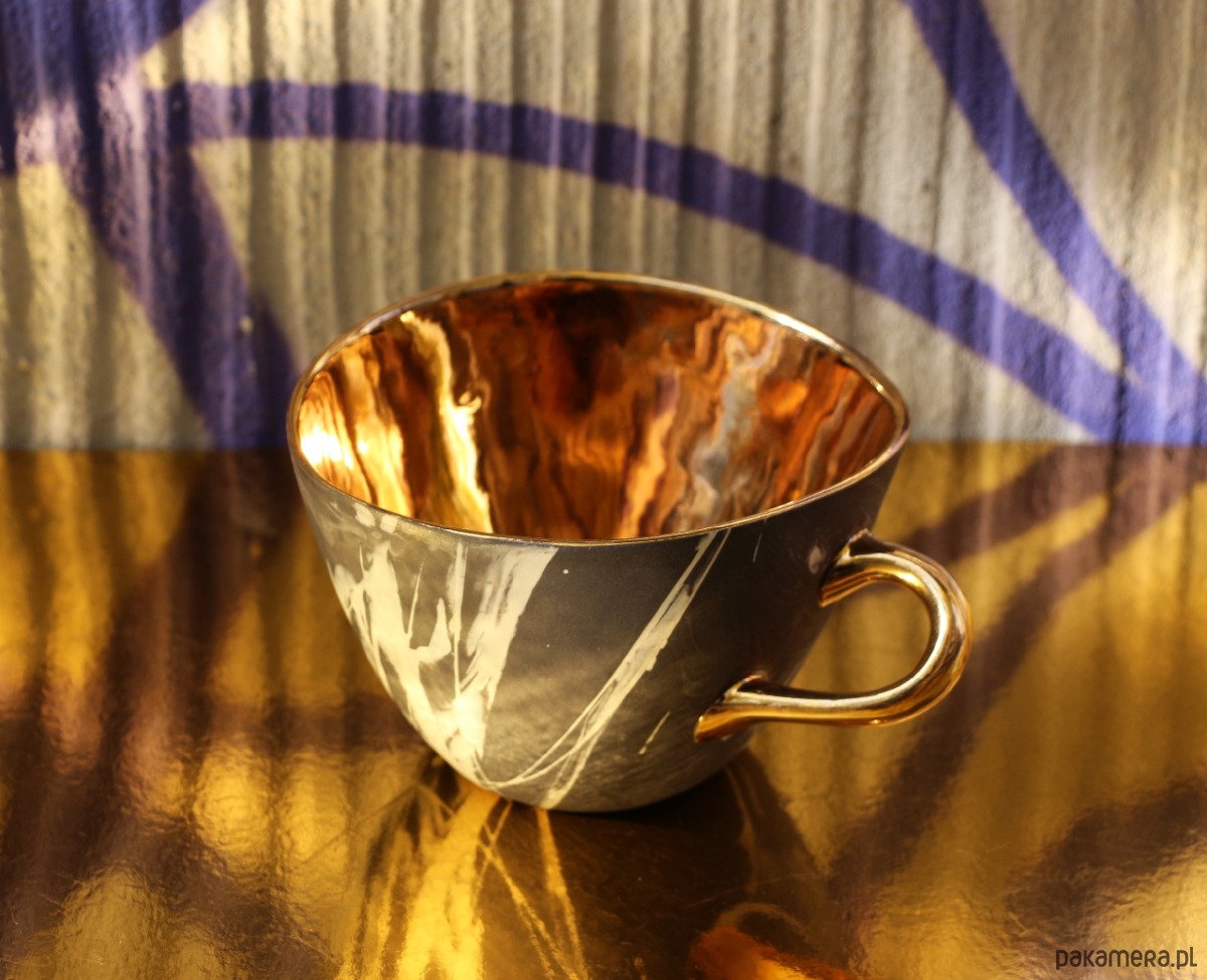 Obłędna filiżanka wykonana ręcznie z barwionej ceramiki. Wnętrze oraz uszko pokryte złotem, dopuszczonym do kontaktu z żywnością (gorącymi płynami), wypalonym w wysokiej temperaturze. Z zewnątrz matowa, bardzo przyjemna w dotyku.