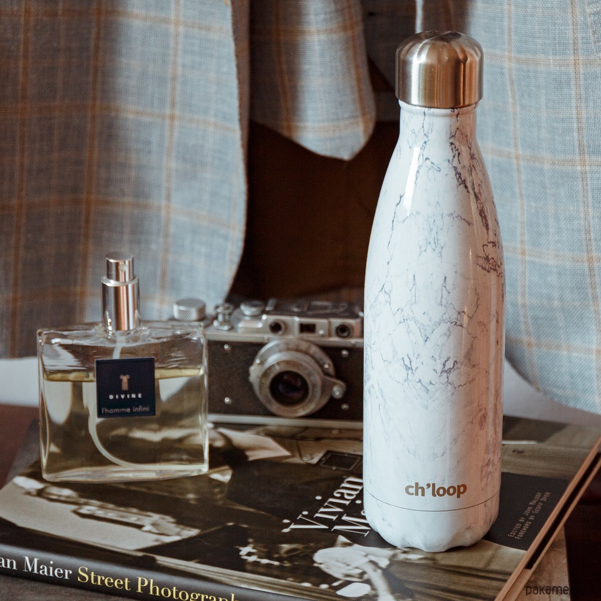 Proekologiczna butelka wielokrotnego użytku we wzorze imitującym biały marmur.