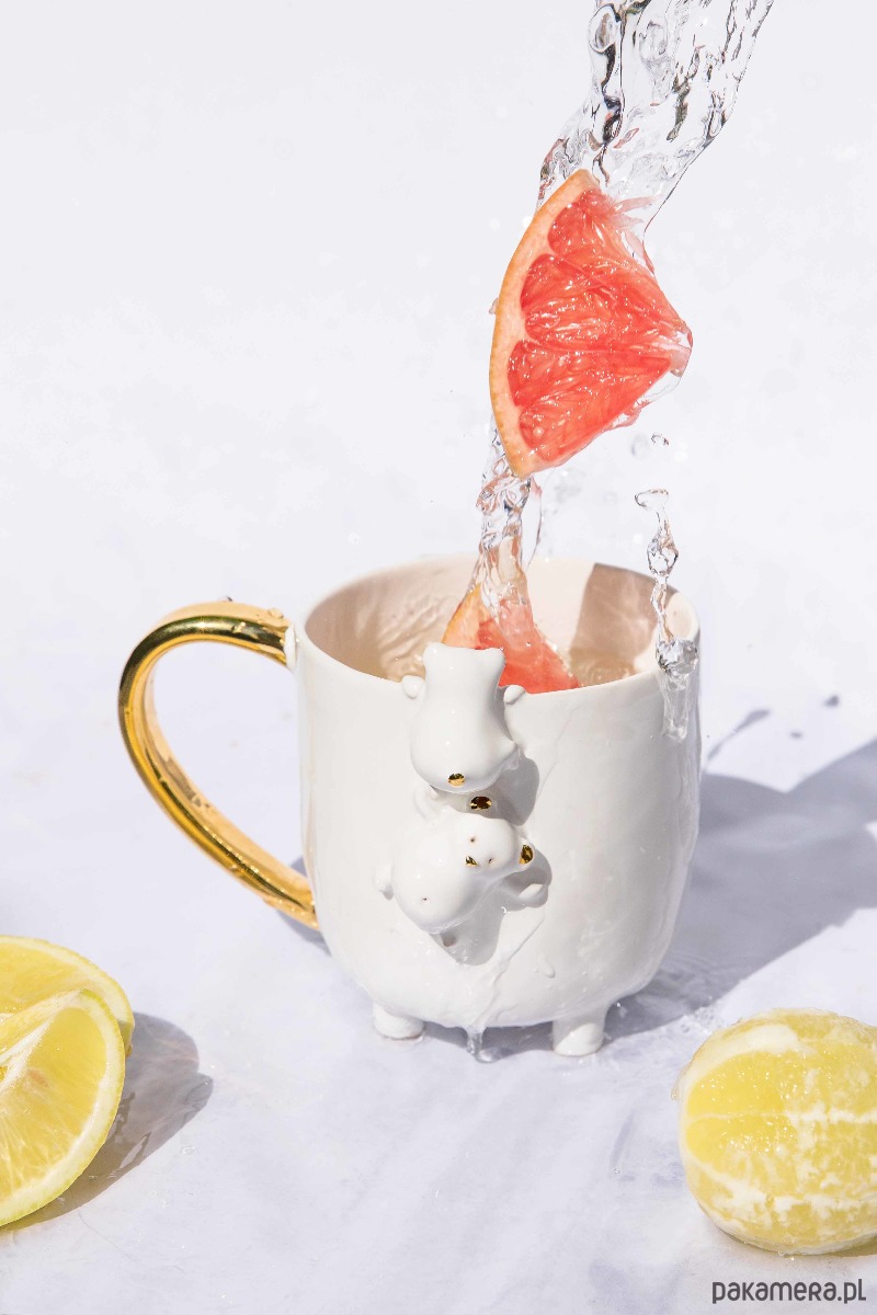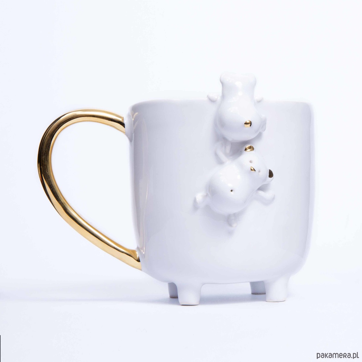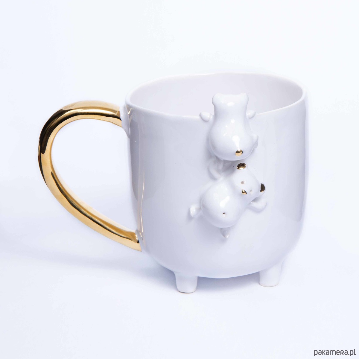 Duży ceramiczny kubek z dwoma wspinającymi się misiami z okrągłymi brzuszkami. Jeden z misiów ciekawie zagląda do wnętrza kubeczka. Kubek jest szkliwiony w kolorze białym. Uszy, noski i ogonki niedźwiadków oraz uchwyty kubeczków zostały ozdobione złotem. Pastelowy kolor pięknie podkreśla złocenia i nadaje mu wyjątkowy, romantyczny charakter.
