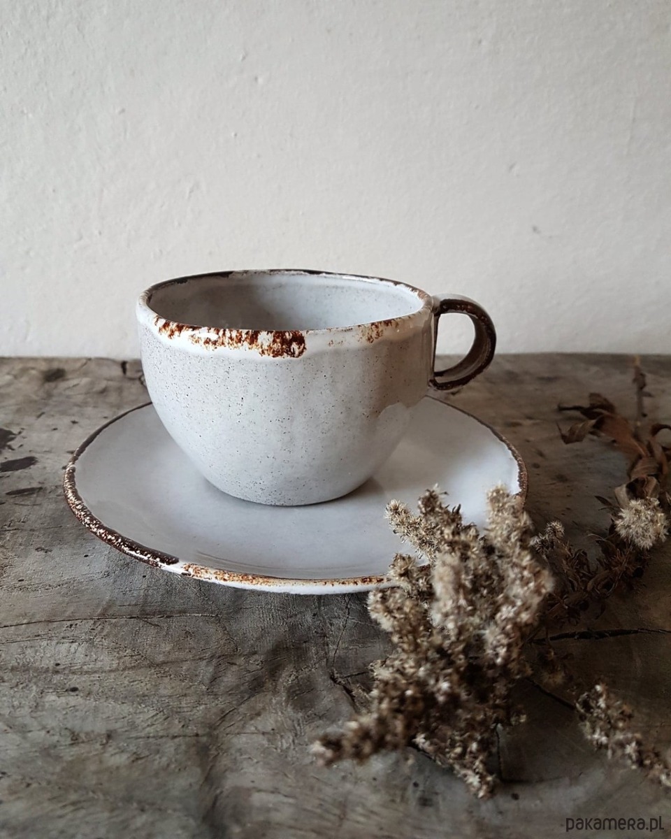 Kubek o pojemności 300 ml, wraz z talerzykiem, poszkliwiony białym błyszczącym szkliwem. Rant kubka i talerzyka w kolorze brązu. W niektórych miejscach spod szkliwa przebijają brązowe kropeczki. Kubek idealnie nadaje się na herbatę lub kawę. Kubek można myć w zmywarce. Kubek, który do Ciebie trafi lepiony jest ręcznie. Nosi ślady naszych rąk i posiada krzywizny, które przypominają o unikatowości każdej pracy, którą stworzyliśmy.