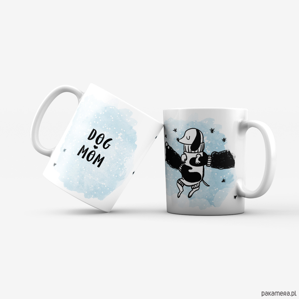 Nadruk dwustronny - z jednej strony kubka ilustracja z pieskiem, z drugiej napis Dog Mom.