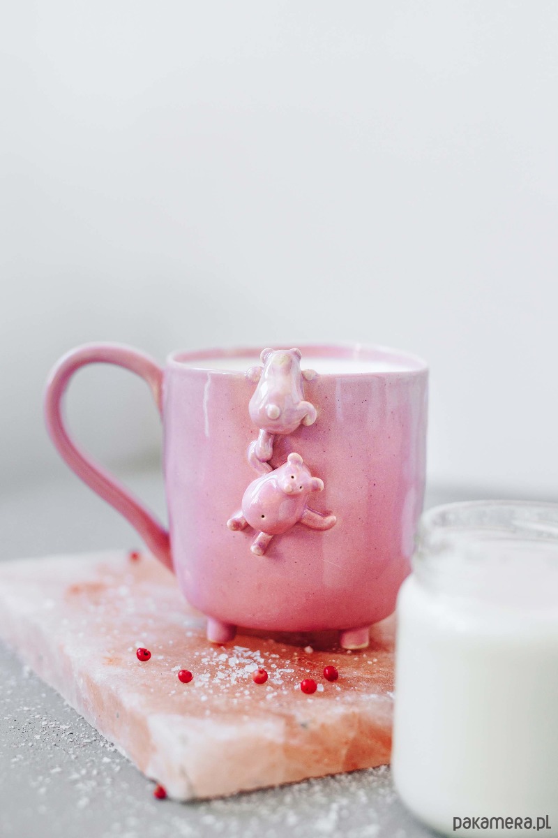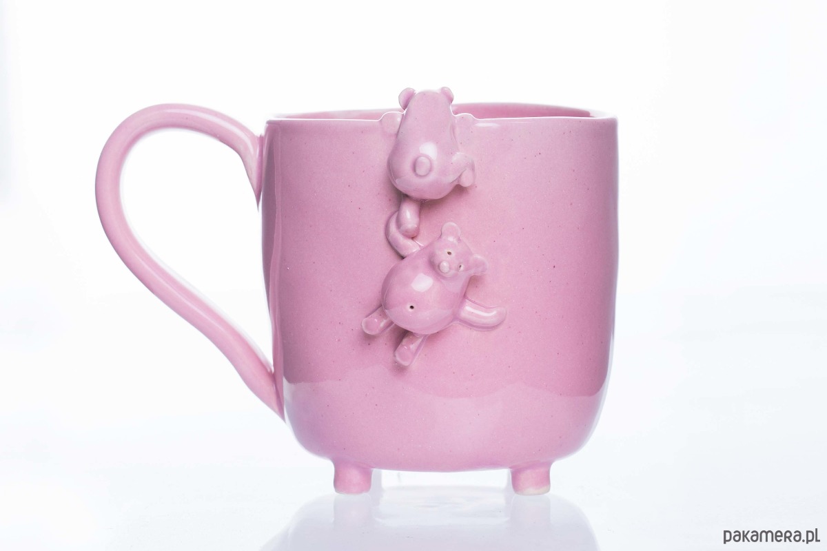 Duży kubek ceramiczny, na który wspina się pewien pękaty miś... Kubek jest w szkliwiony w kolorze pudrowego różu i na każdym etapie został wykonany ręcznie, bez użycia koła garncarskiego. Dzięki temu posiada nieco nieregularną formę i może delikatnie różnić od tego widocznego na zdjęciu. Każdy miś jest niepowtarzalny w swoich detalach. Sygnowany na spodzie.