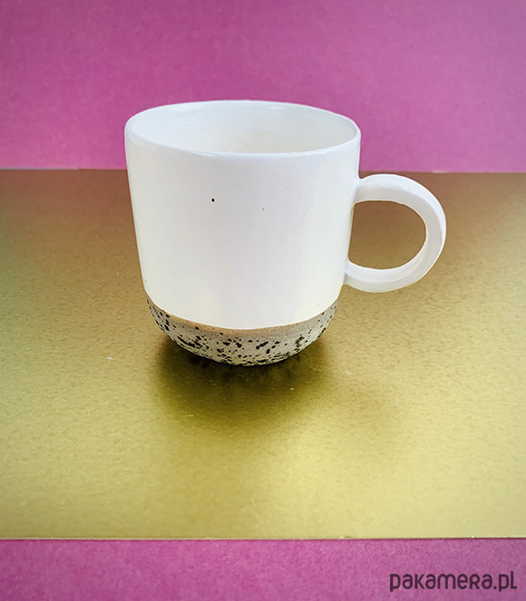 Wykonany z białej gliny, z dekoracyjnym paskiem na spodzie - uwaga wewnątrz kubek jest całkowicie biały. Wypalany na wysoką temperaturę.