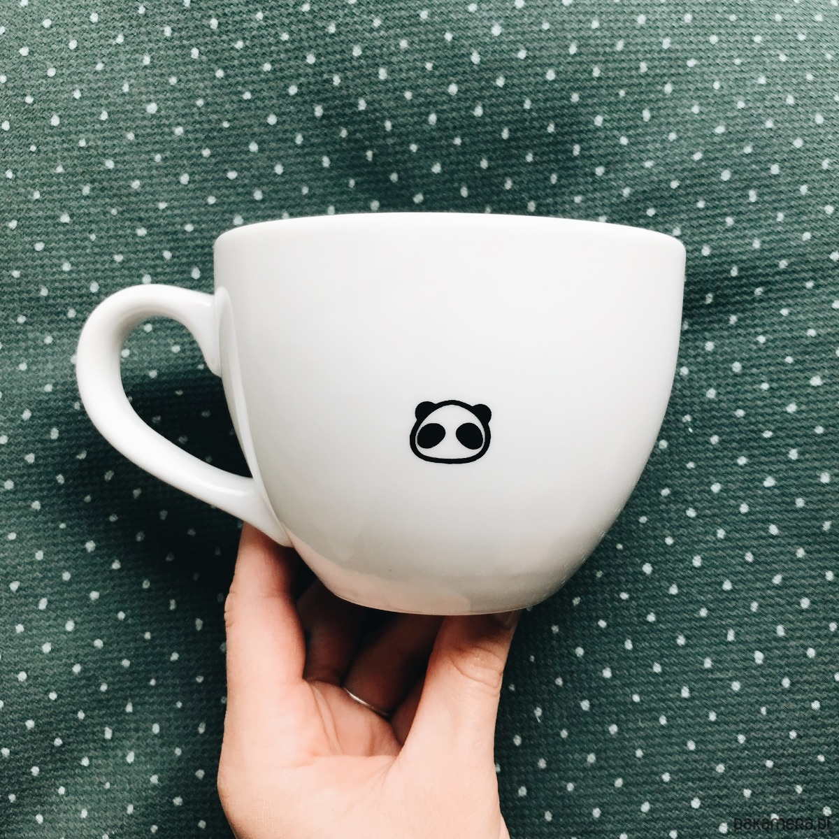 Biały kubek na kawę i herbatę dekorowany ręcznie według autorskiego projektu.