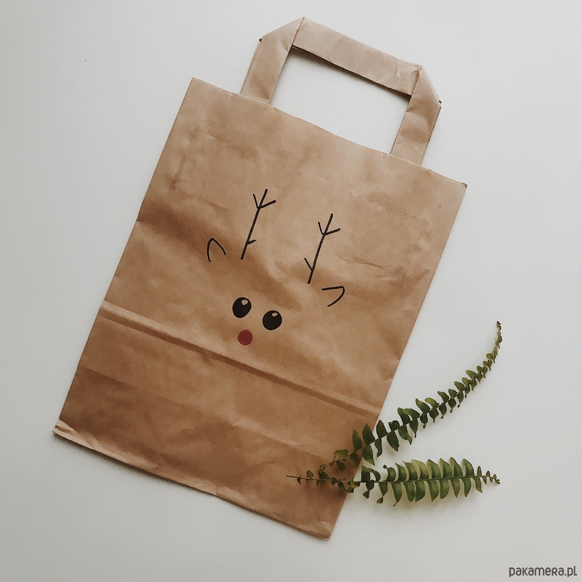 Papierowa torba z reniferem, w którą możesz zapakować swoje świąteczne prezenty.