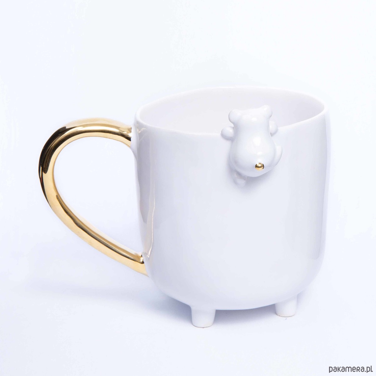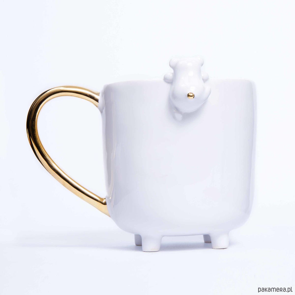 Duży ceramiczny kubek z wspinającym się misiem z okrągłym brzuszkiem. Miś ciekawie zagląda do wnętrza kubeczka. Kubek jest szkliwiony w kolorze białym. Uszy, nosek i ogonek niedźwiadka oraz uchwyt kubeczka zostały ozdobione złotem. Pastelowy kolor pięknie podkreśla złocenia i nadaje mu wyjątkowy, romantyczny charakter.