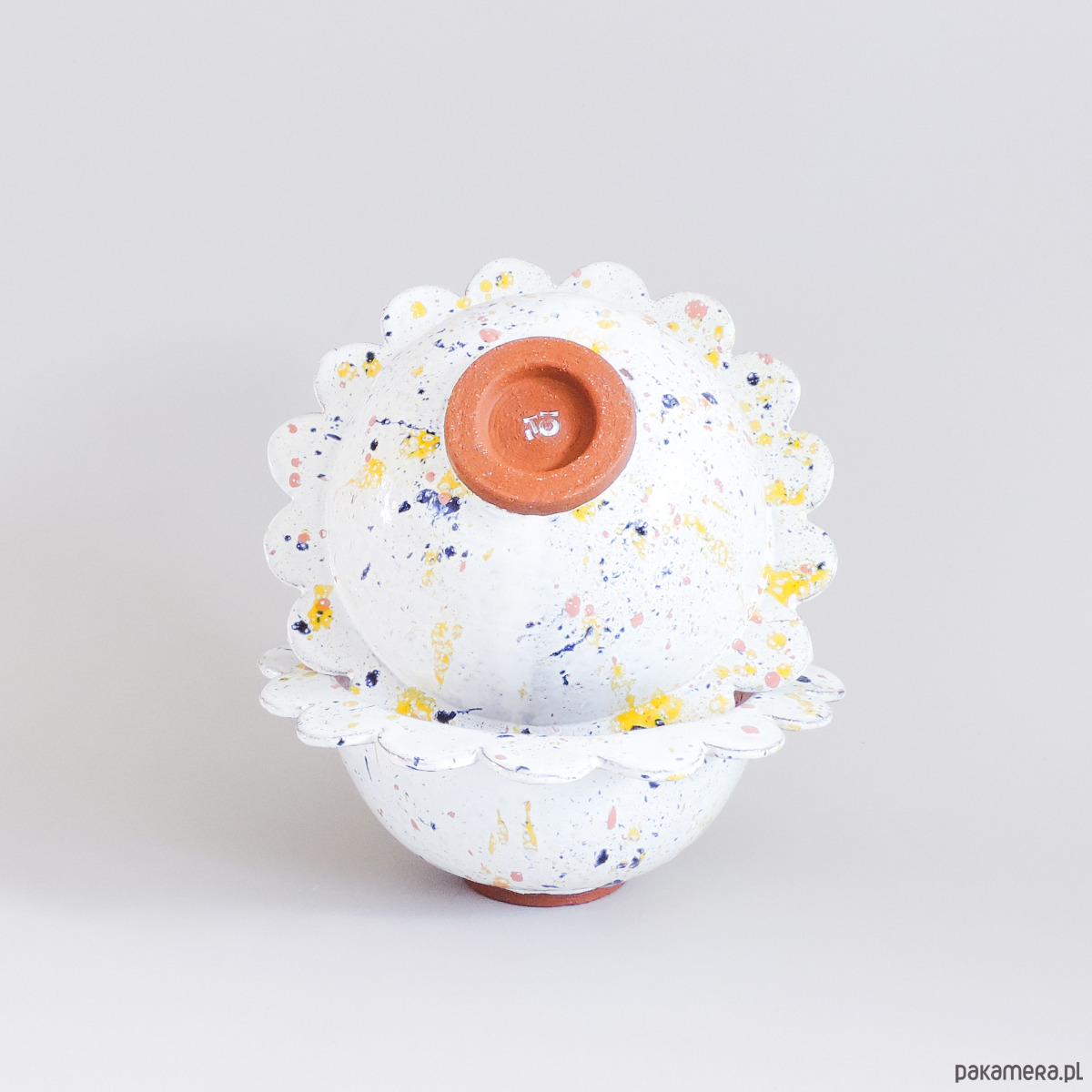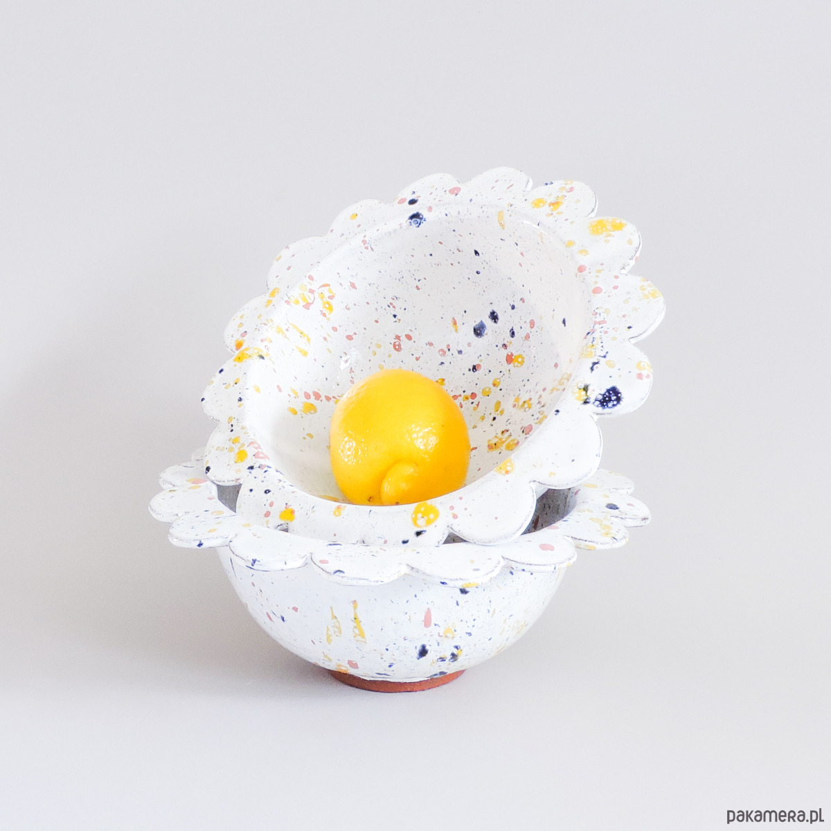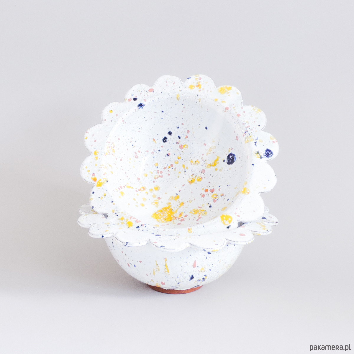 Ręcznie wykonana na kole garncarskim gliniana miska w kolorowe plamki.