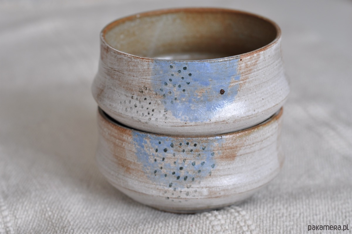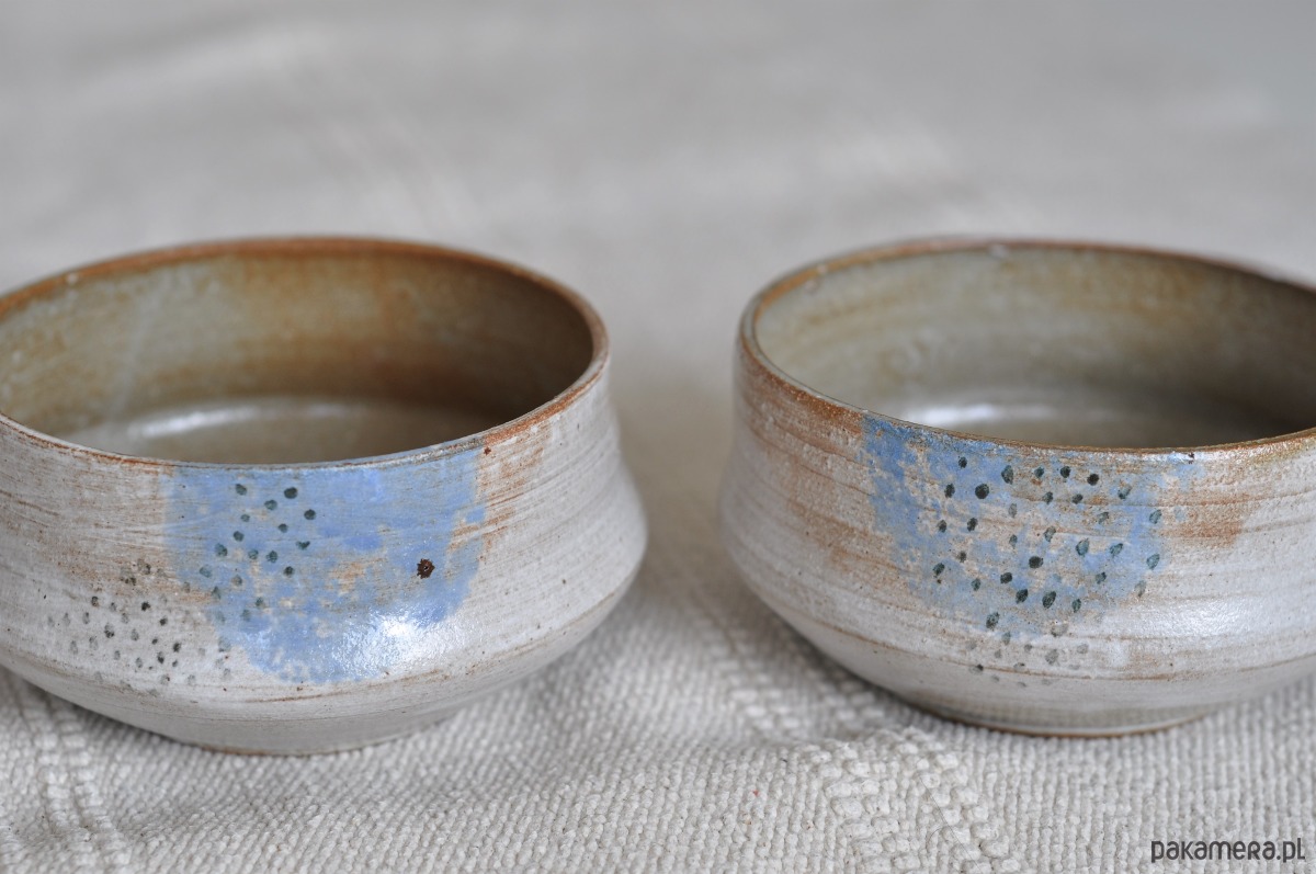 Komplet dwóch kamionkowych misek na zupę. W odcieniach bieli, brązu z indywidualną aplikacją niebieska. Są rustykalne i proste. Bardzo dobrze prezentują się w nich zupy kremy, bogate w składniki zupy azjatyckie.