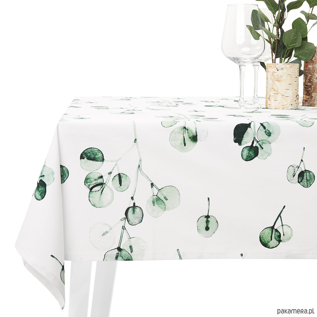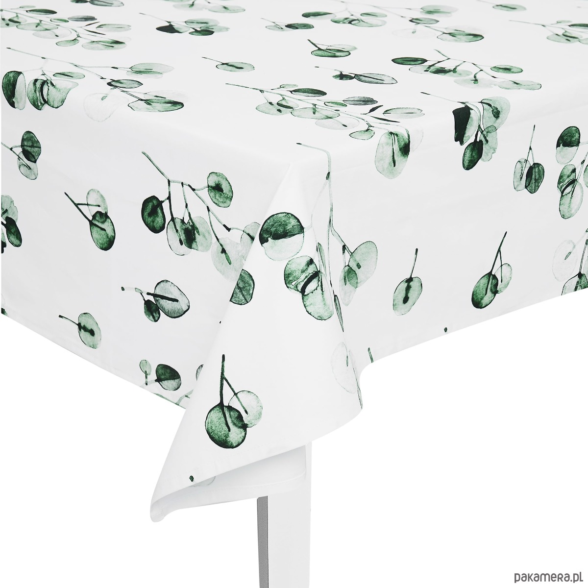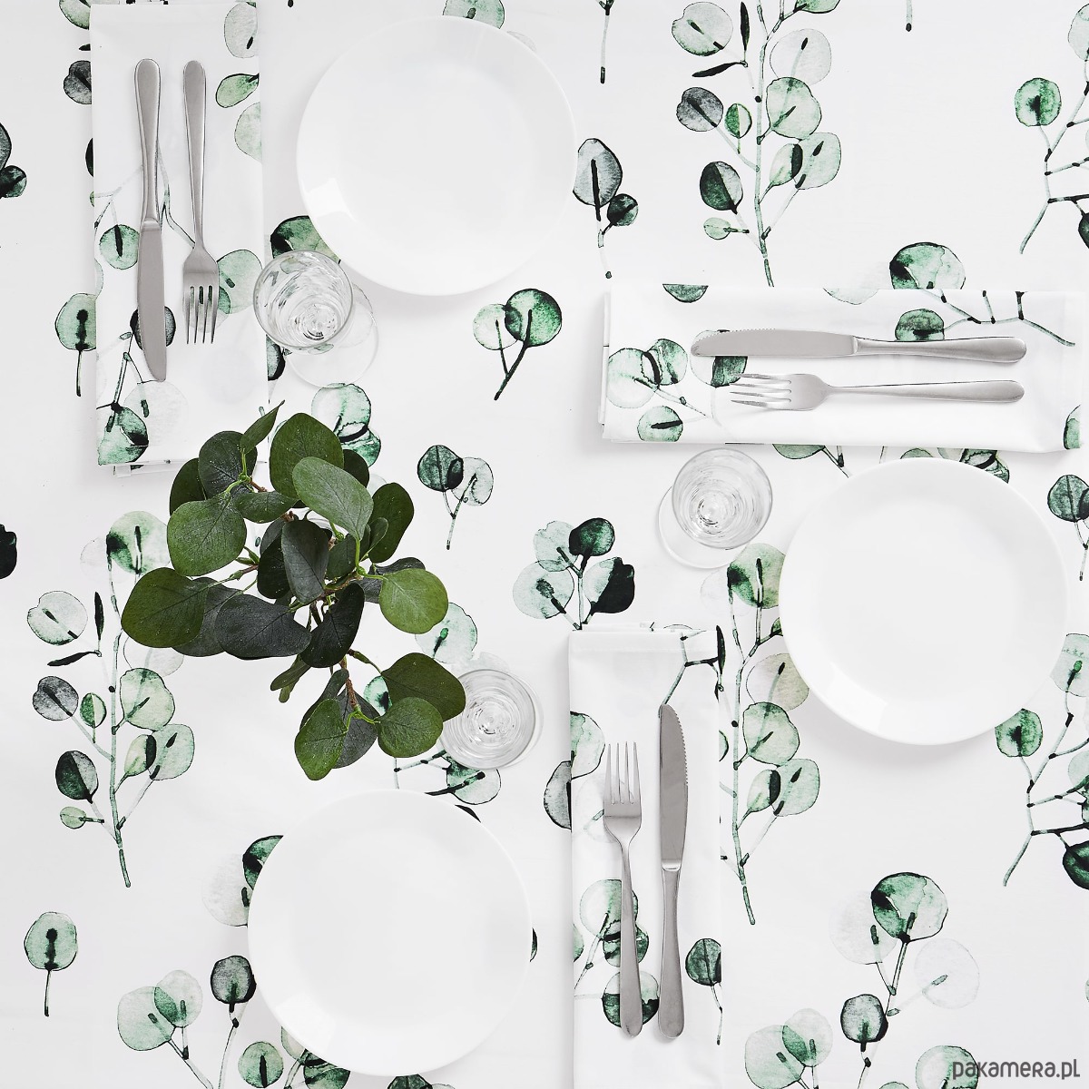 Obrus z grubszej bawełny w malowane liście eukaliptusa. Doskonała dekoracja stołu.