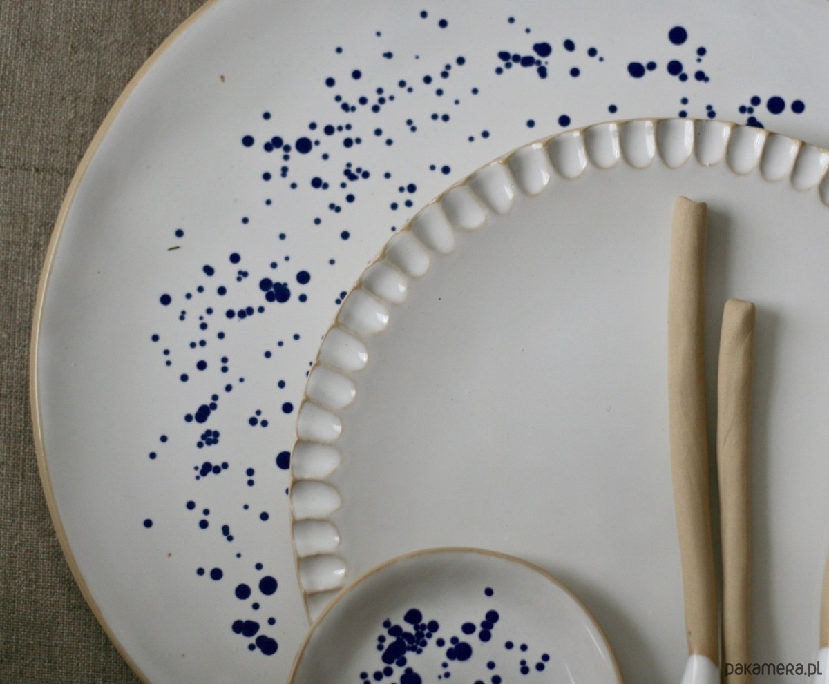 szkliwo białe z połyskiem z niebieskimi nieregularnymi kropkami