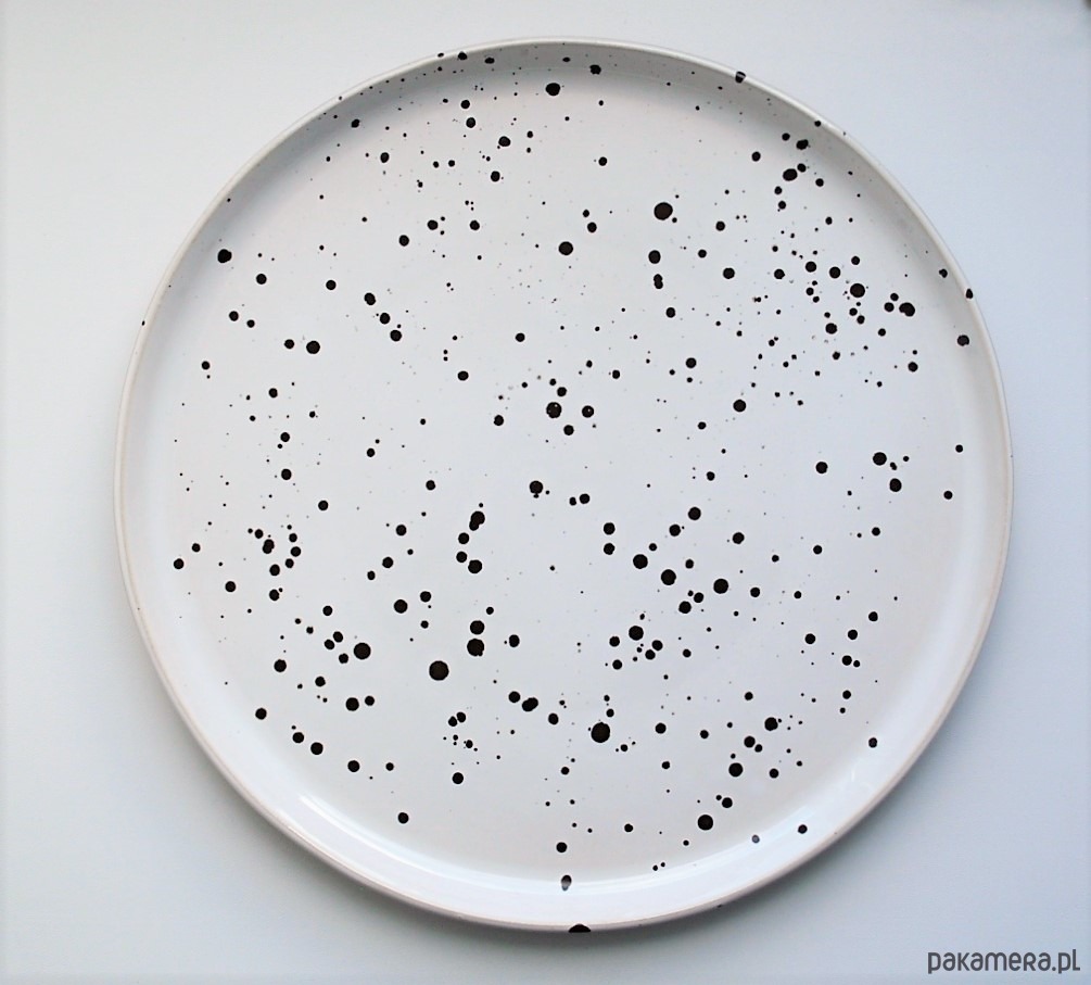 Talerz pokryty jest białym szkliwem spożywczym z licznymi nakropieniami w czerni i szarości.