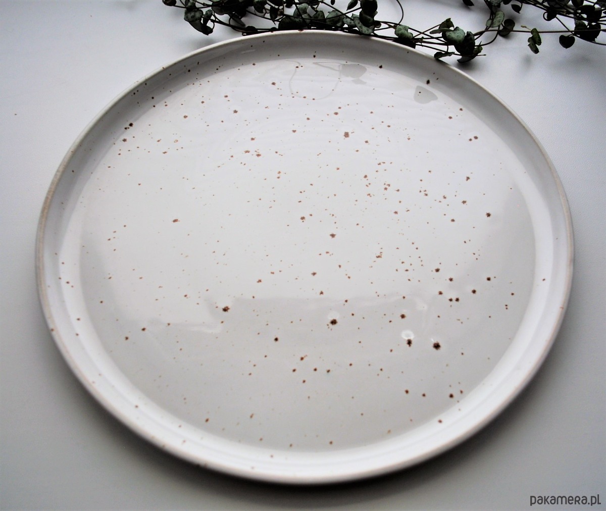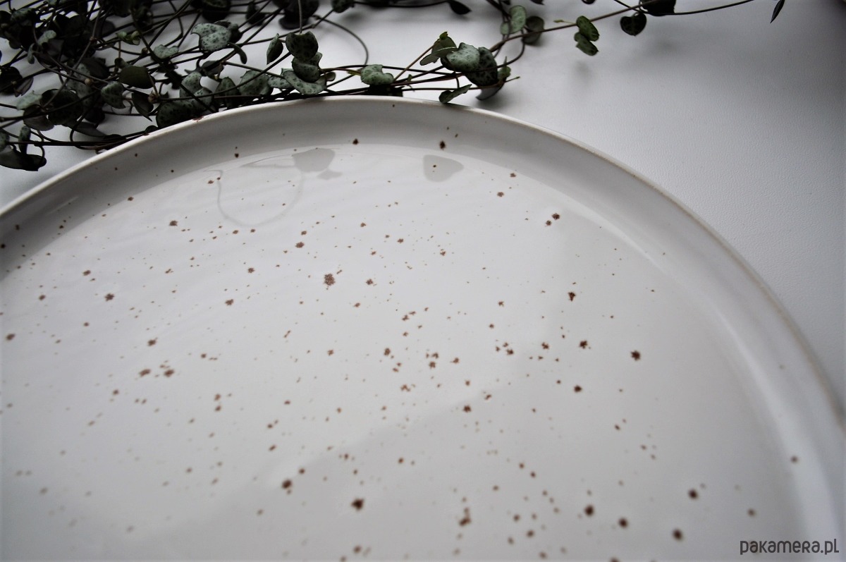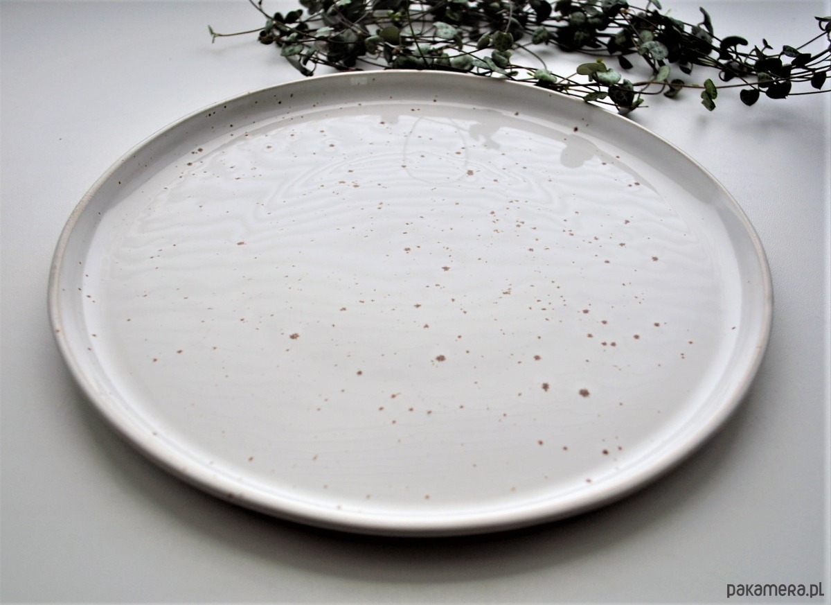 Talerz pokryty jest białym szkliwem spożywczym z licznymi nakropieniami w odcieniach ciepłego ciemnego beżu, jasnego brązu.