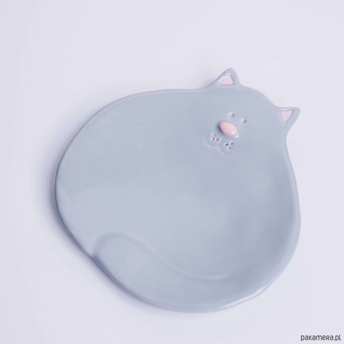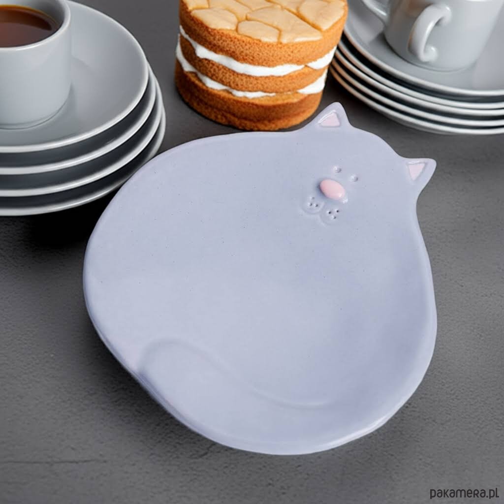 Ceramiczny talerzyk w kształcie kota z noskiem, kocimi uszkami, zawiniętym ogonem i uśmiechem. Talerzyk może służyć do podawania drobnych potraw, słodyczy, przechowywania niewielkich rzeczy, jako mydelniczka lub podstawka na świece.