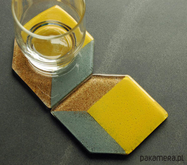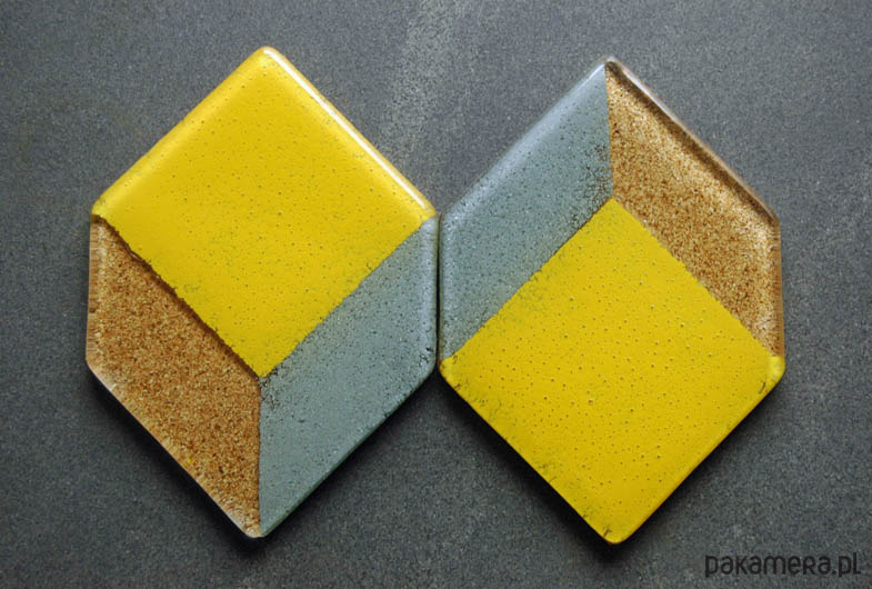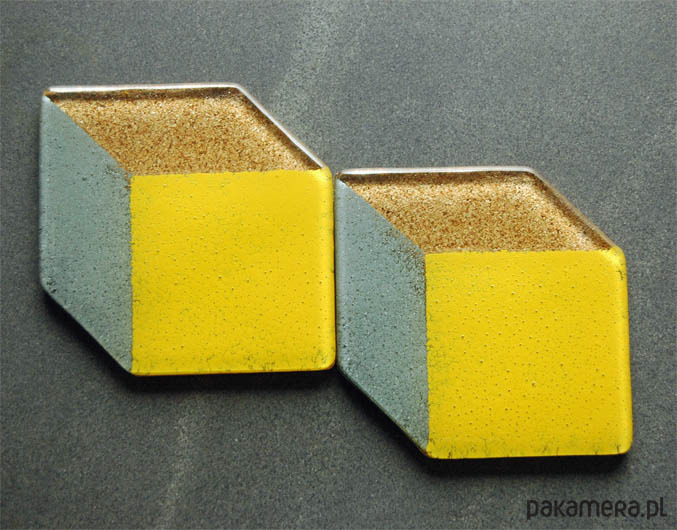 Zestaw dwóch podkładek pod szklanki, wykonany ze szkła w technice fusingu. Kolor i wzór trwale zgrzany w temperaturze powyżej 800st. C pomiędzy dwoma taflami szkła. Od spodu podklejony korek. Wymiary ok.13x9cm.