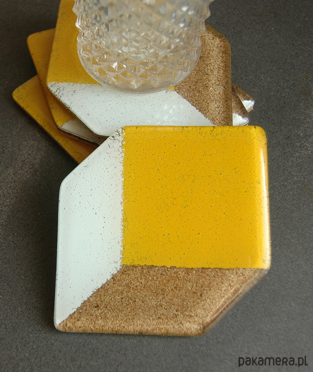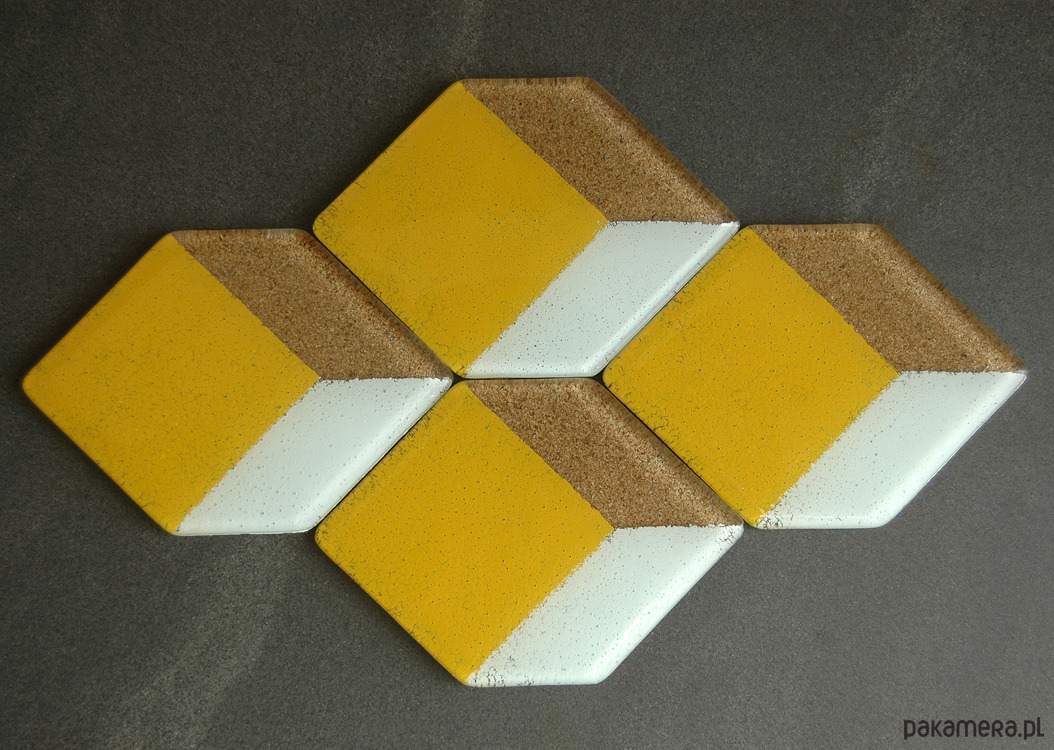 Komplet czterech podkładek pod szklanki, wykonany ze szkła w technice fusingu. Kolor i wzór trwale zgrzany pomiędzy dwoma taflami szkła w temperaturze powyżej 800st. C . Spodnia strona szkła podklejona wysokiej jakości korkiem. Wymiary ok.13x9cm.