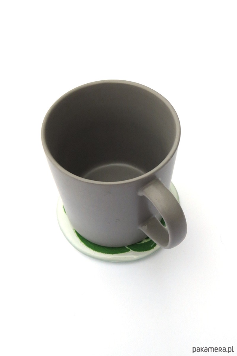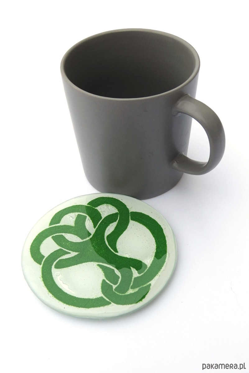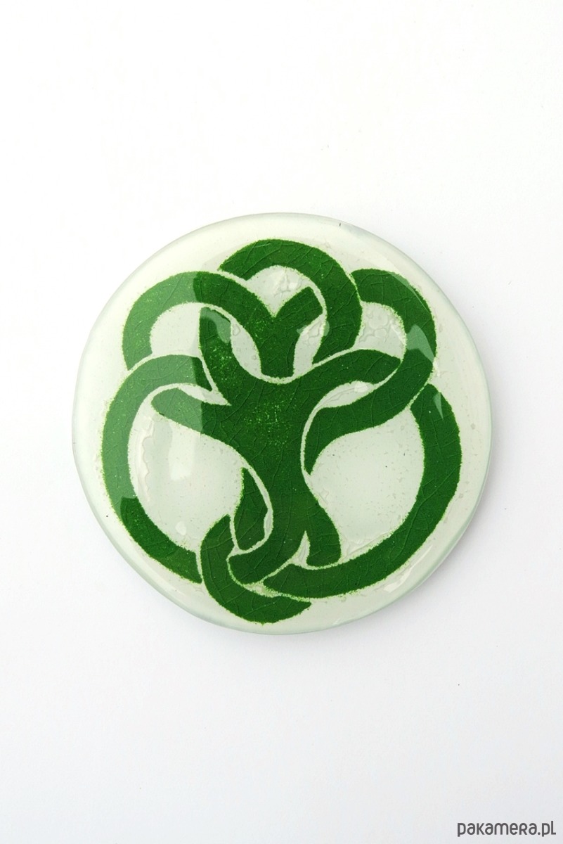 Podkładka w kształcie koła. Zielony wzór drzewa celtyckiego na białym tle zatopiony jest pomiędzy dwoma warstwami szkła . Krawędzie gładkie i równe. Podklejone silikonowymi kroplami.