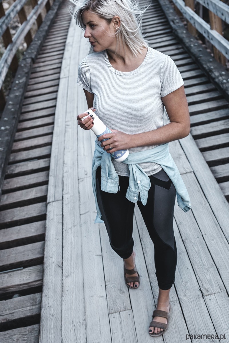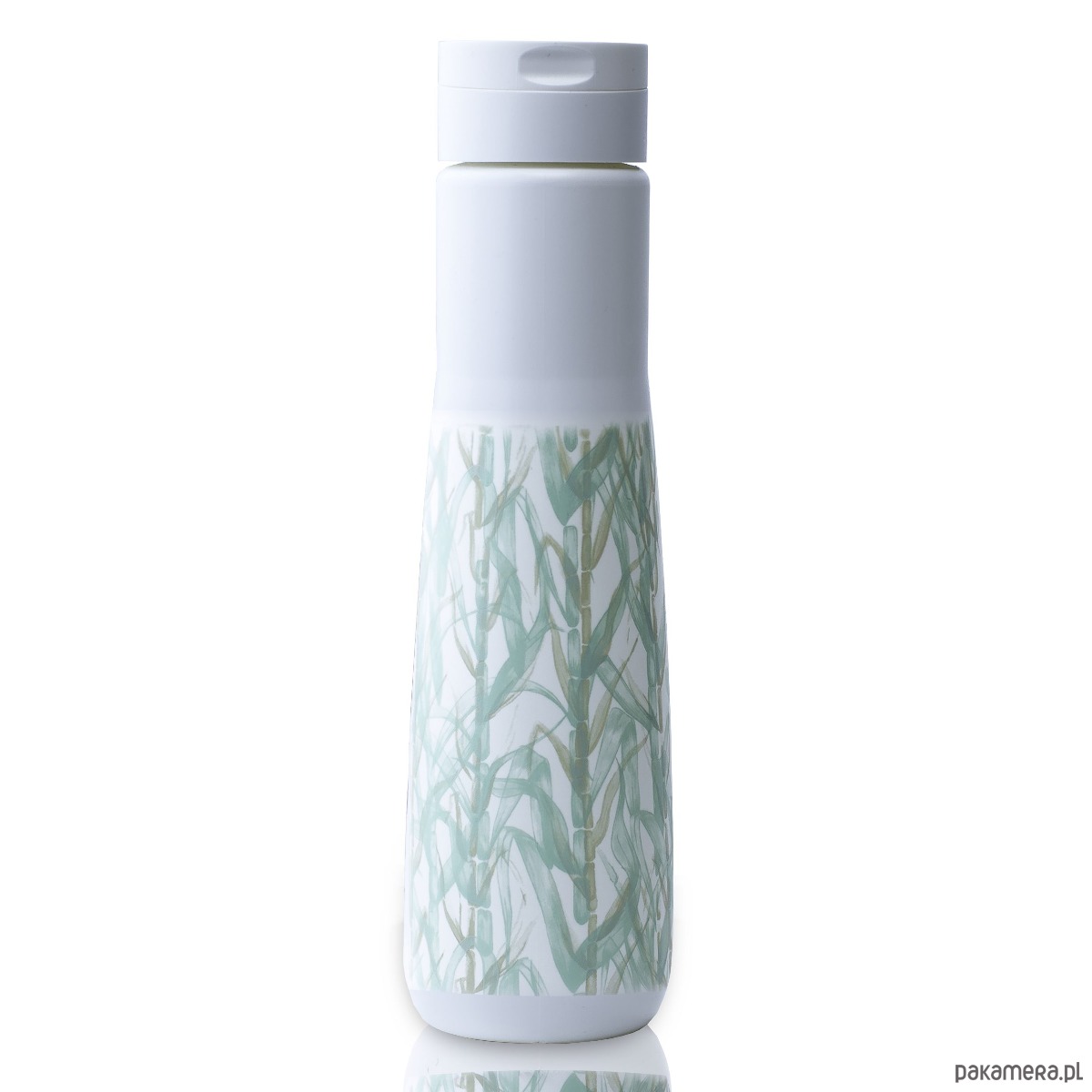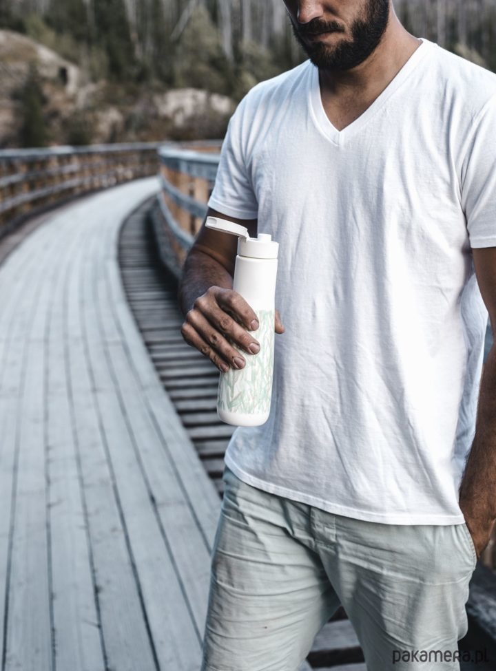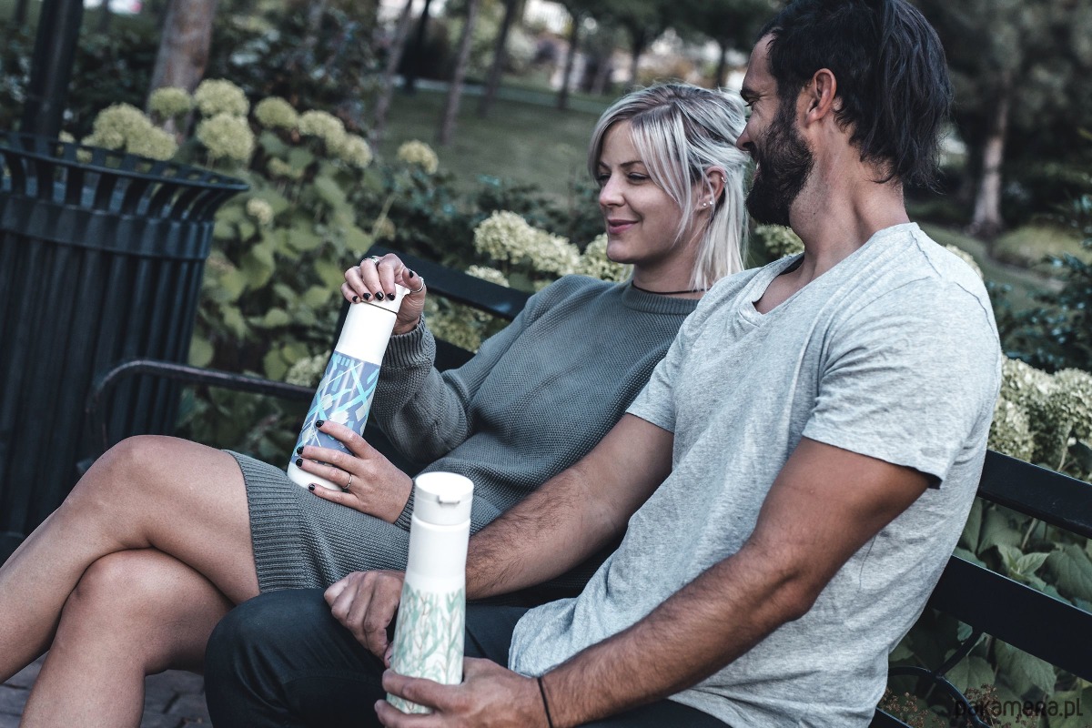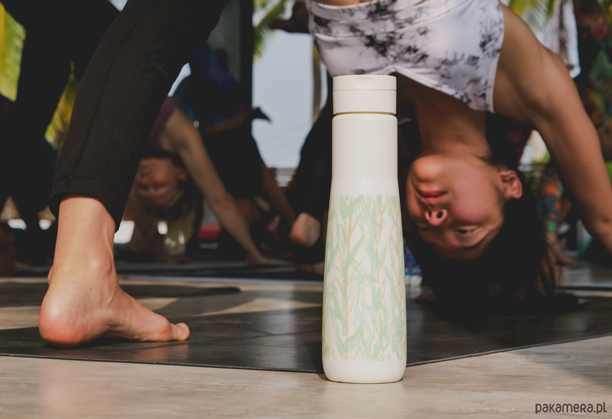 Butelka na wodę Yuhme z motywem The Namaste – grafika inspirowana naturą oraz odnawialnym charakterem surowca jakim jest trzcina cukrowa.
