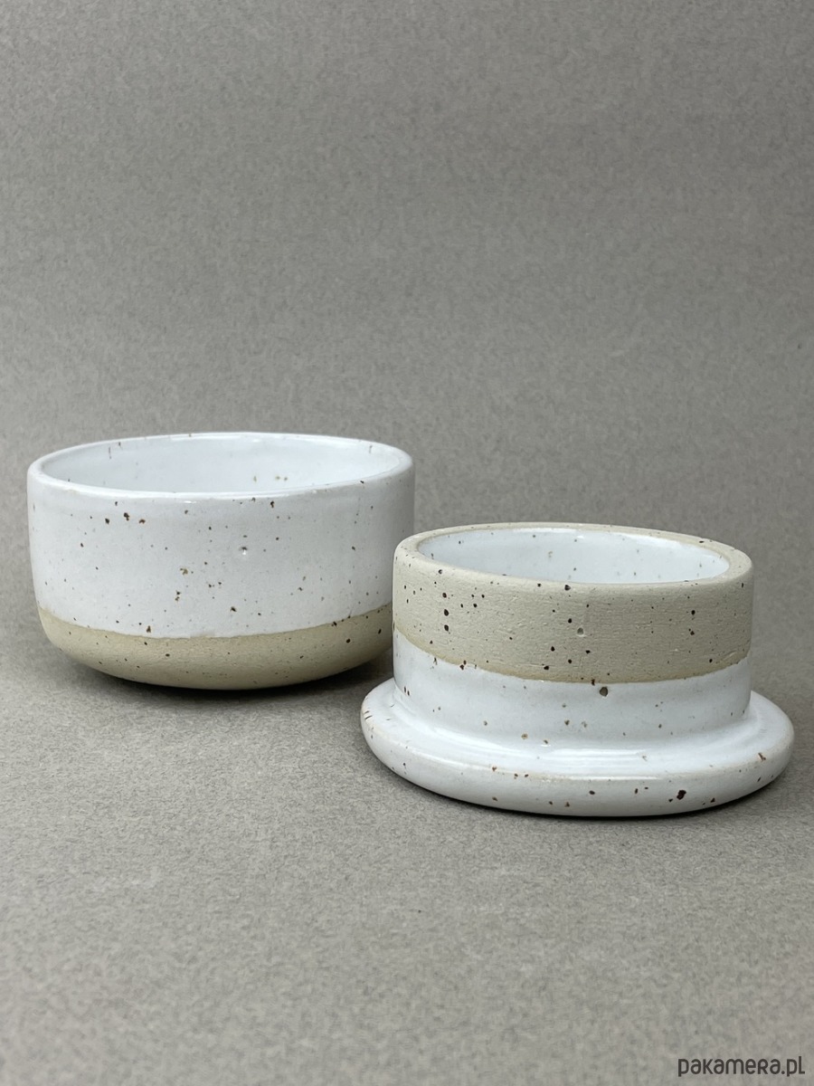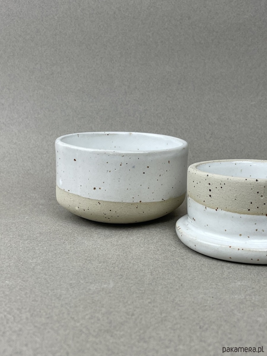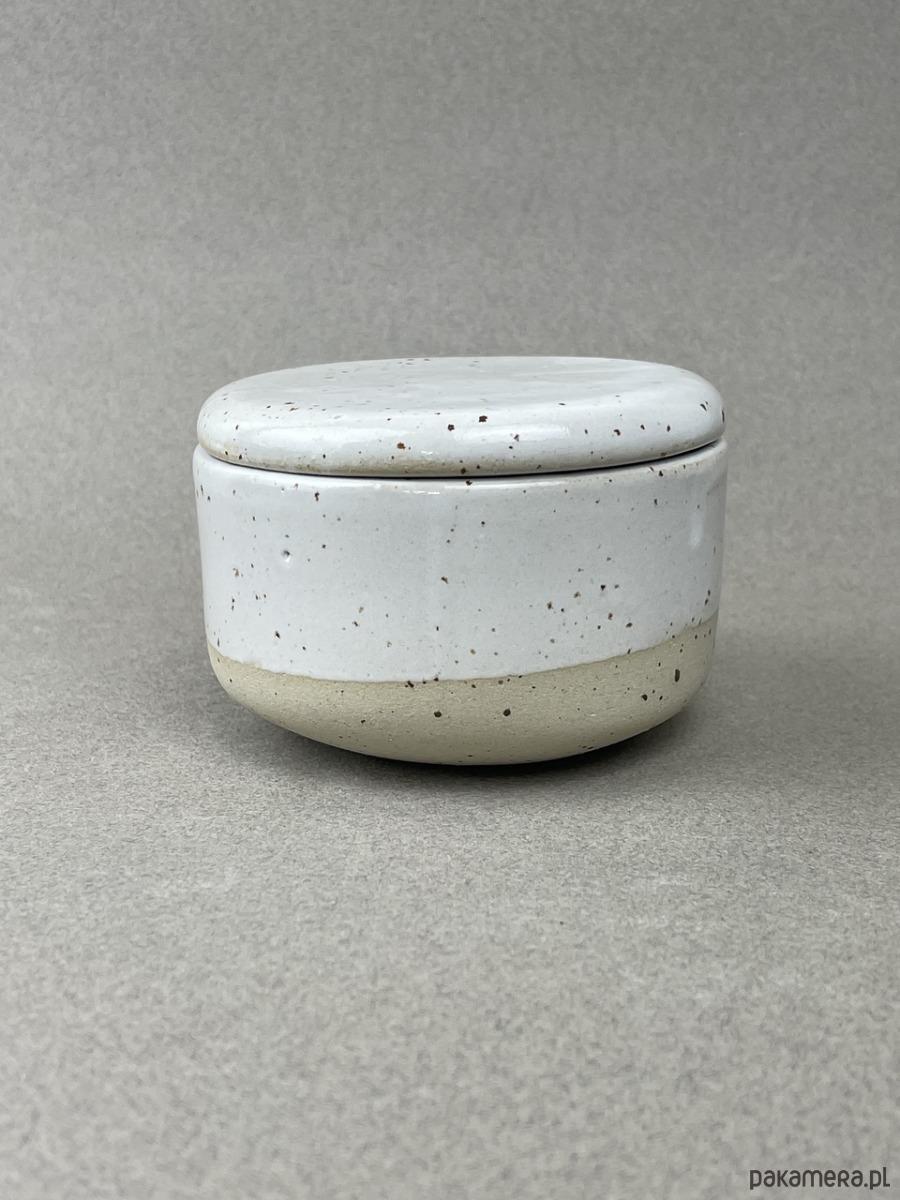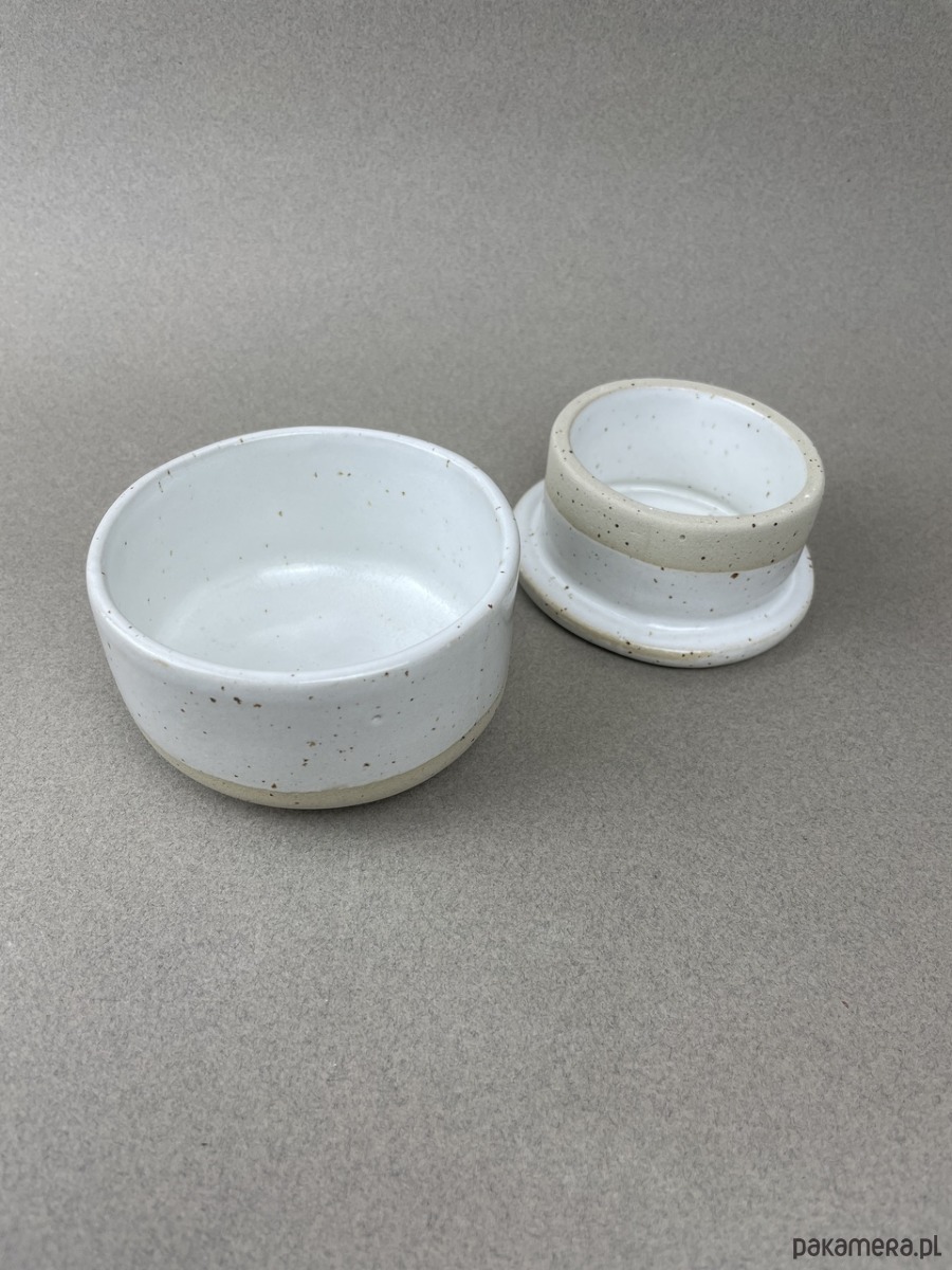 Nasza maselczniczka jest wykonana z beżowej gliny w kropki, pokryta białym szkliwem.