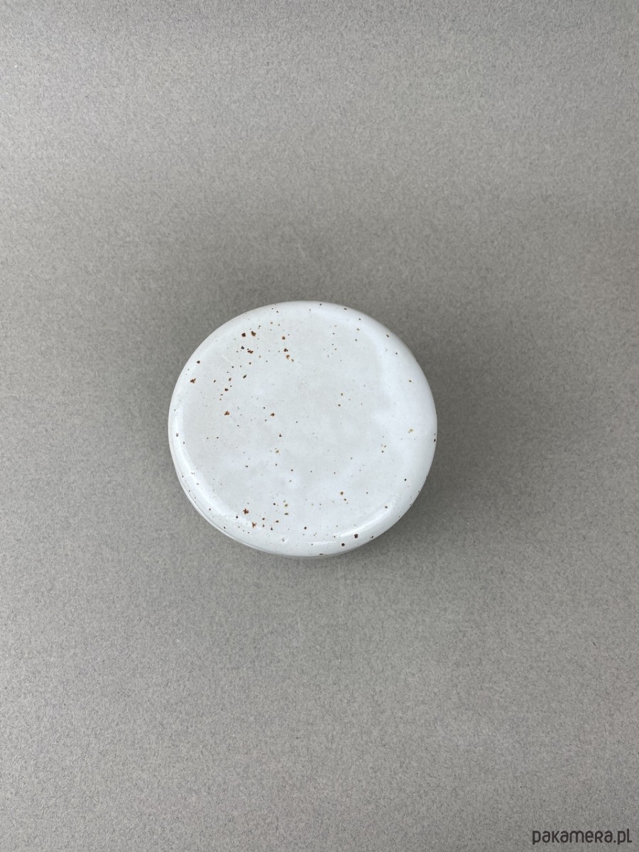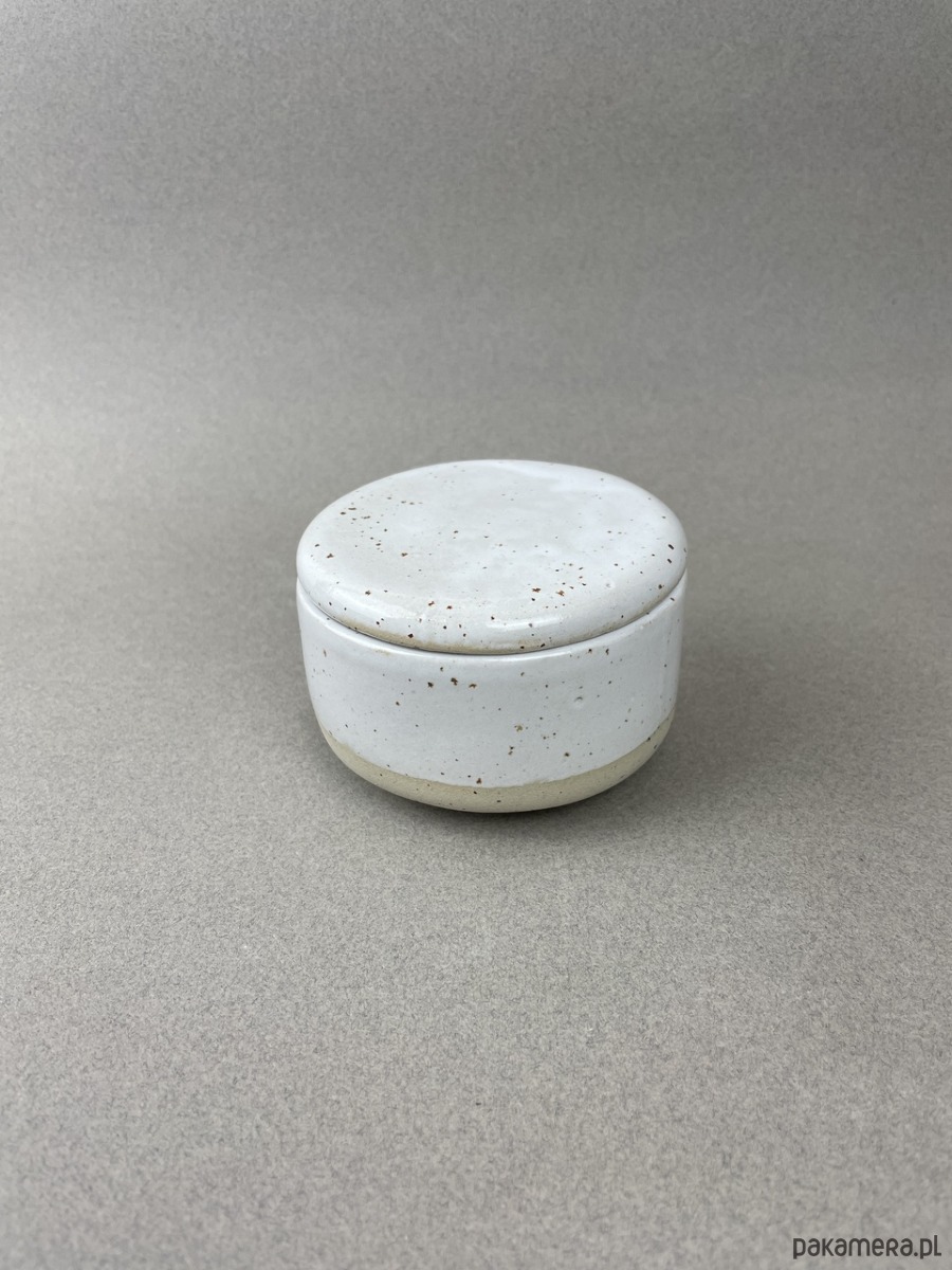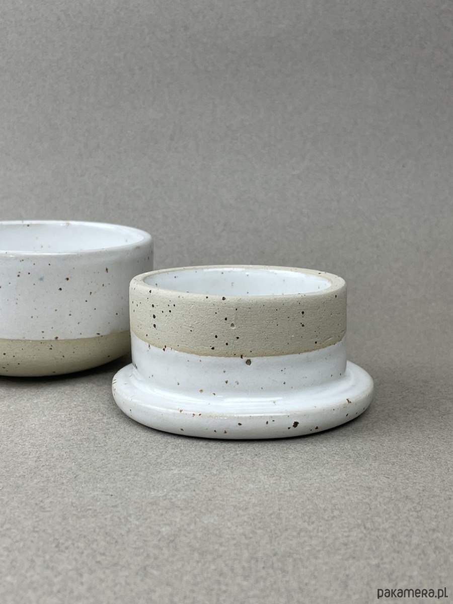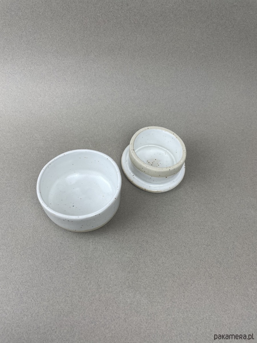 Nasza maselczniczka jest wykonana z beżowej gliny w kropki, pokryta białym szkliwem.