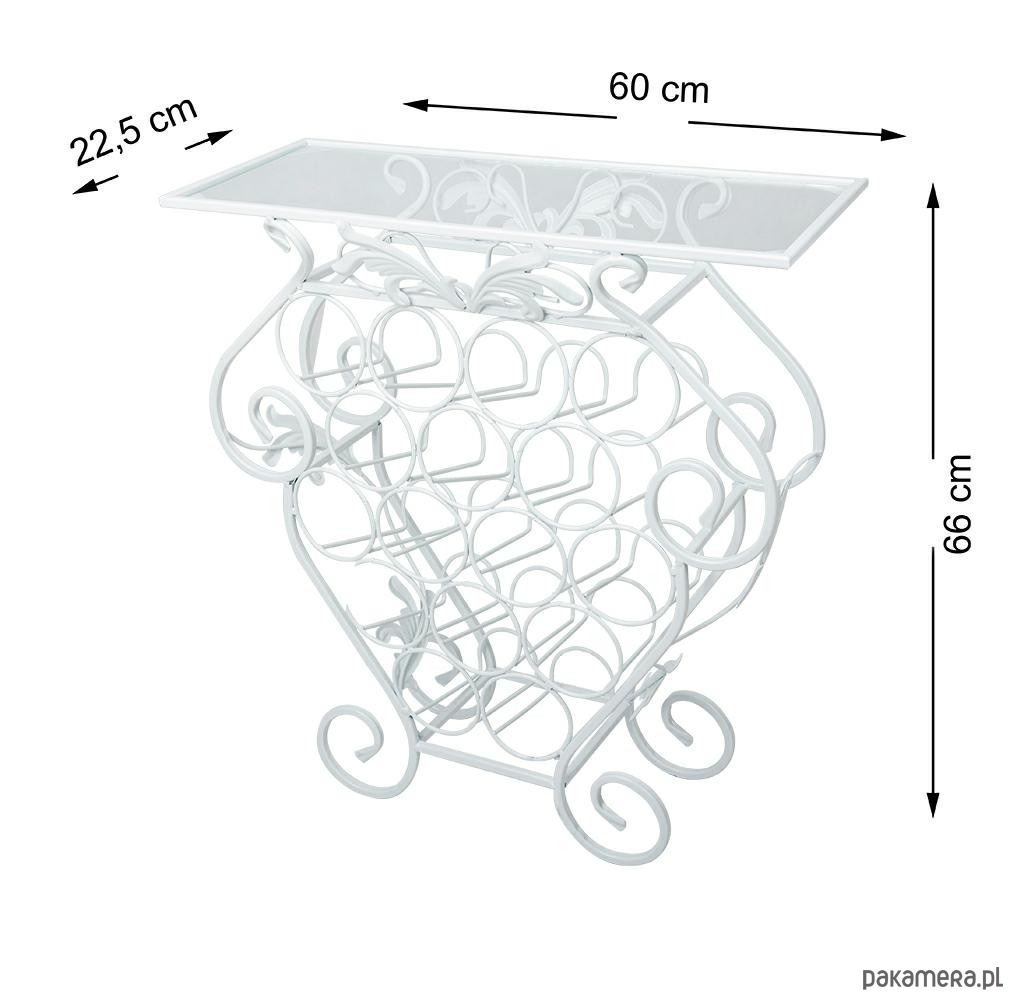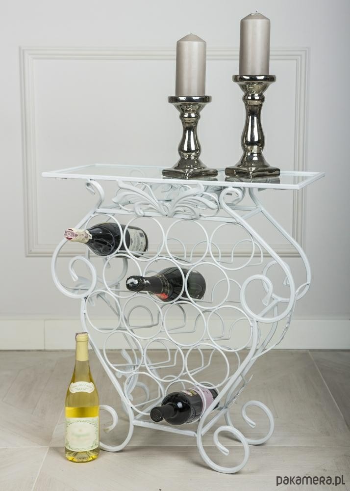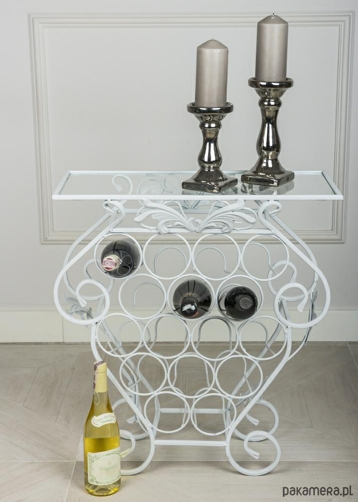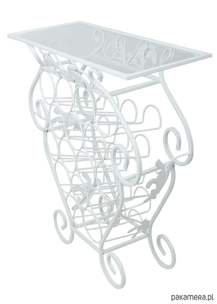 Artystycznie wykonany barek na butelki ze stolikiem. Solidna, wzmocniona konstrukcja zapewnia długoletnie, bezproblemowe użytkowanie. Całość wykonana zostałą z metalu pokrytego białym lakierem. Piękne zakuwane elementy oraz niezwykle dekoracyjne zakręcane nogi są główną ozdobą. Szybę w stole umieszcza się wewnątrz blatu. Służą do tego specjalnie zamontowane blaszki.