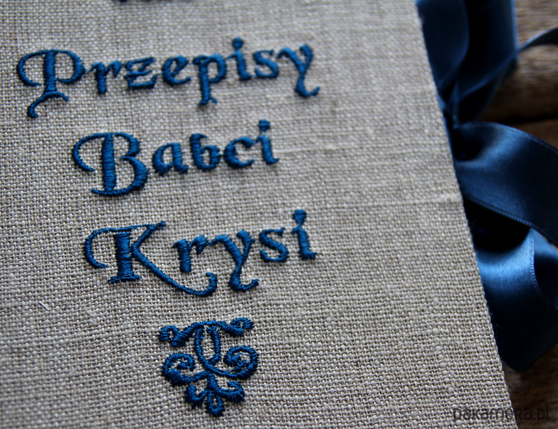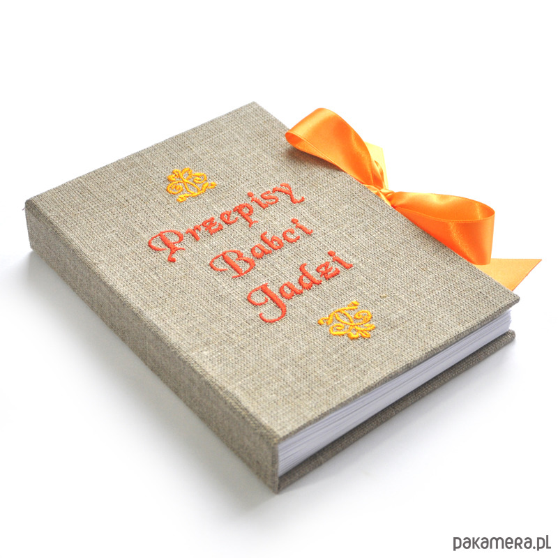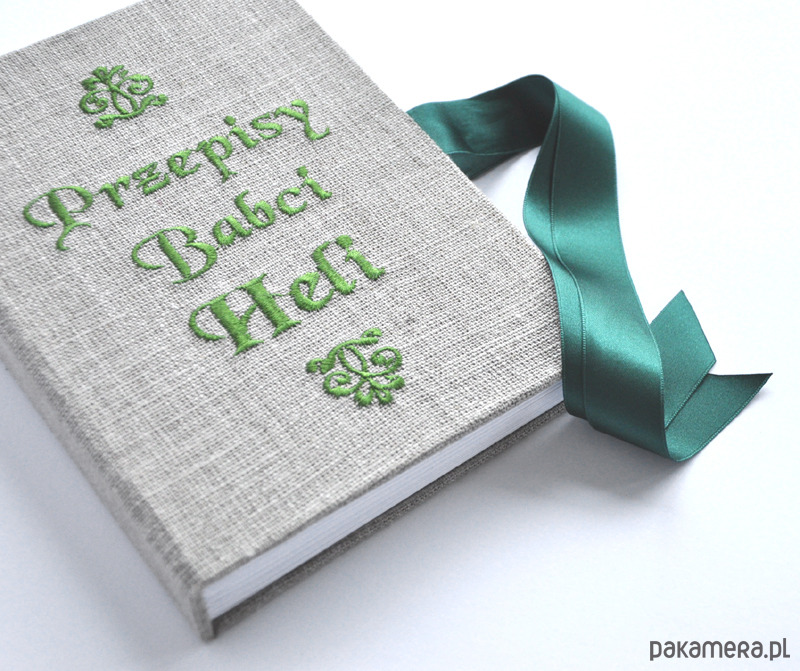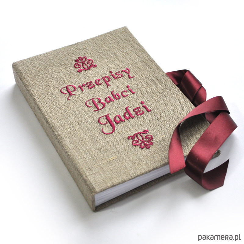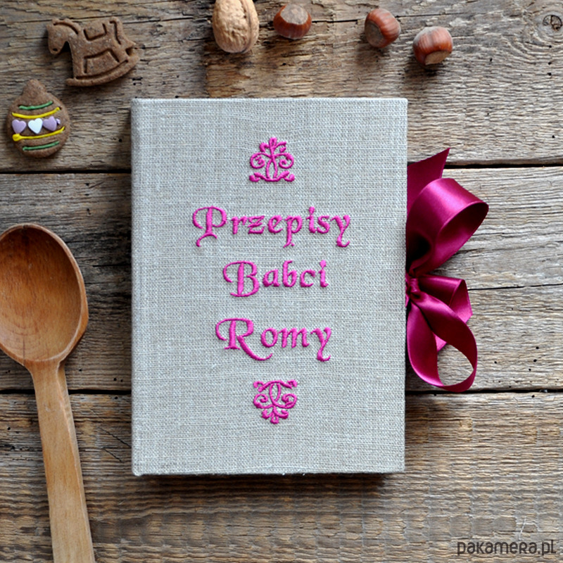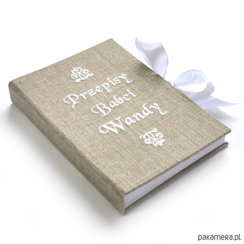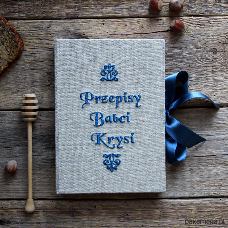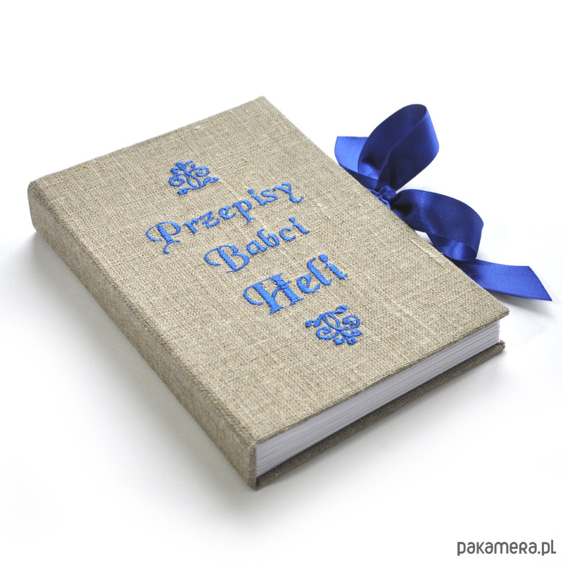 Personalizowana książka kucharska, okładka obita płótnem lnianym z wyhaftowanym napisem - możliwość wyhaftowania dowolnej treści w dowolnych kolorach, np. "ciasta Ani", "Książka kucharska Tosi" itd... (po zakupie proszę o info poprzez kontakt). Wnętrze kryje 260 stron /130 kartek gładkiego BIAŁEGO papieru. Wymiary 22 x 15 x 3 cm. Kolor granatowy ze zdjęcia to numer 22 (spoza wzornika).