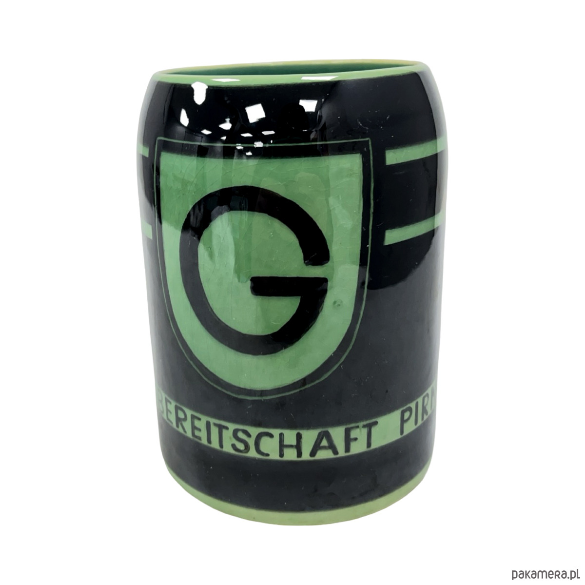 Na powierzchni kufla znajduje się napis „19. Grenzbereitschaft Pirna”, odnoszący się do jednostki formacji granicznej stacjonującej w Pirnie (Saksonia), co nadaje przedmiotowi unikatowy, historyczno-dokumentalny charakter. Tego typu zamówienia okolicznościowe są szczególnie poszukiwane przez kolekcjonerów ceramiki HB oraz miłośników designu i historii NRD.