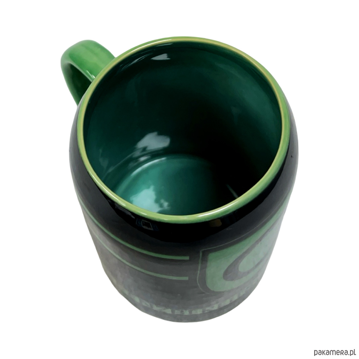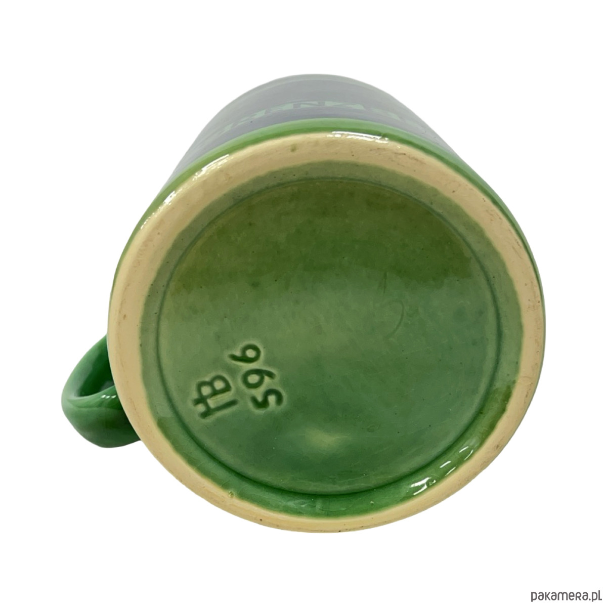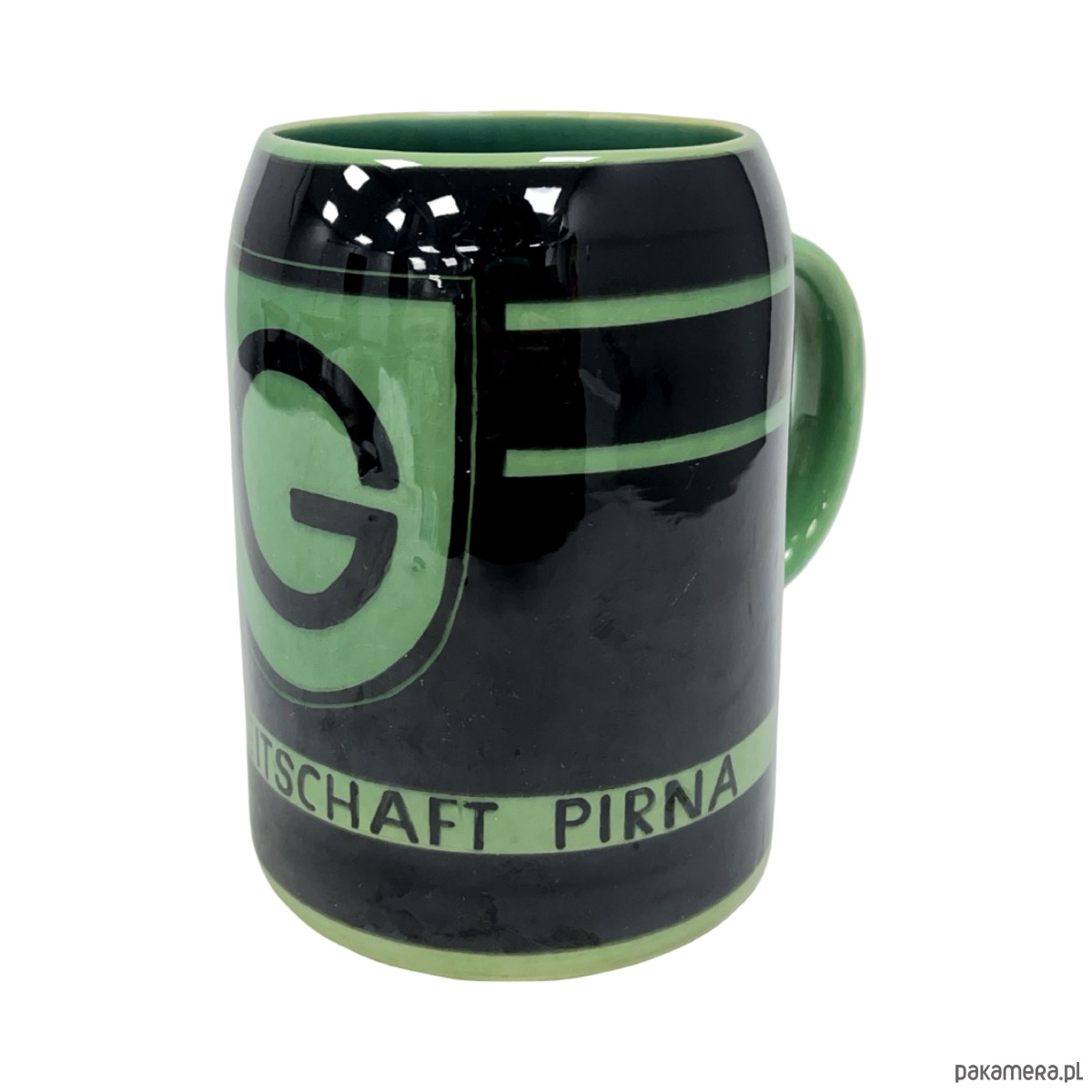 Oryginalny ceramiczny kufel wykonany w manufakturze Hedwig Bollhagen (HB), jednej z najważniejszych i najbardziej cenionych wytwórni ceramiki artystycznej w powojennych Niemczech. Egzemplarz pochodzi z okresu NRD i wyróżnia się wyrazistą, kontrastową dekoracją w kolorach czerni i zieleni oraz typową dla HB prostą, graficzną estetyką inspirowaną modernizmem i Bauhausem.