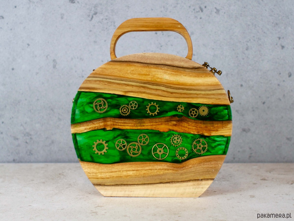 Zamykana na solidny zamek szkatułkowy. Środek wyściełany materiałem typu Alkantara w kolorze ciemnego brązu. Okucia torebki w kolorze antycznego brązu.