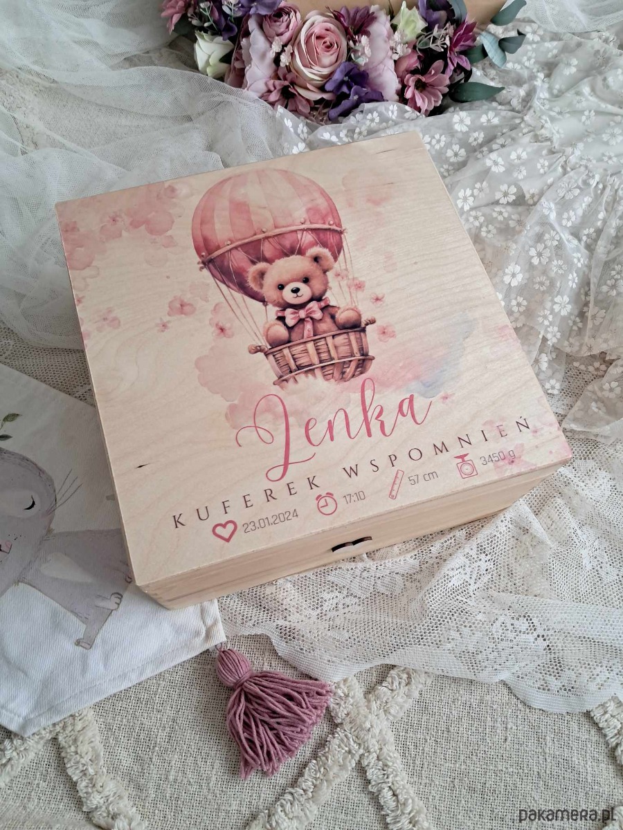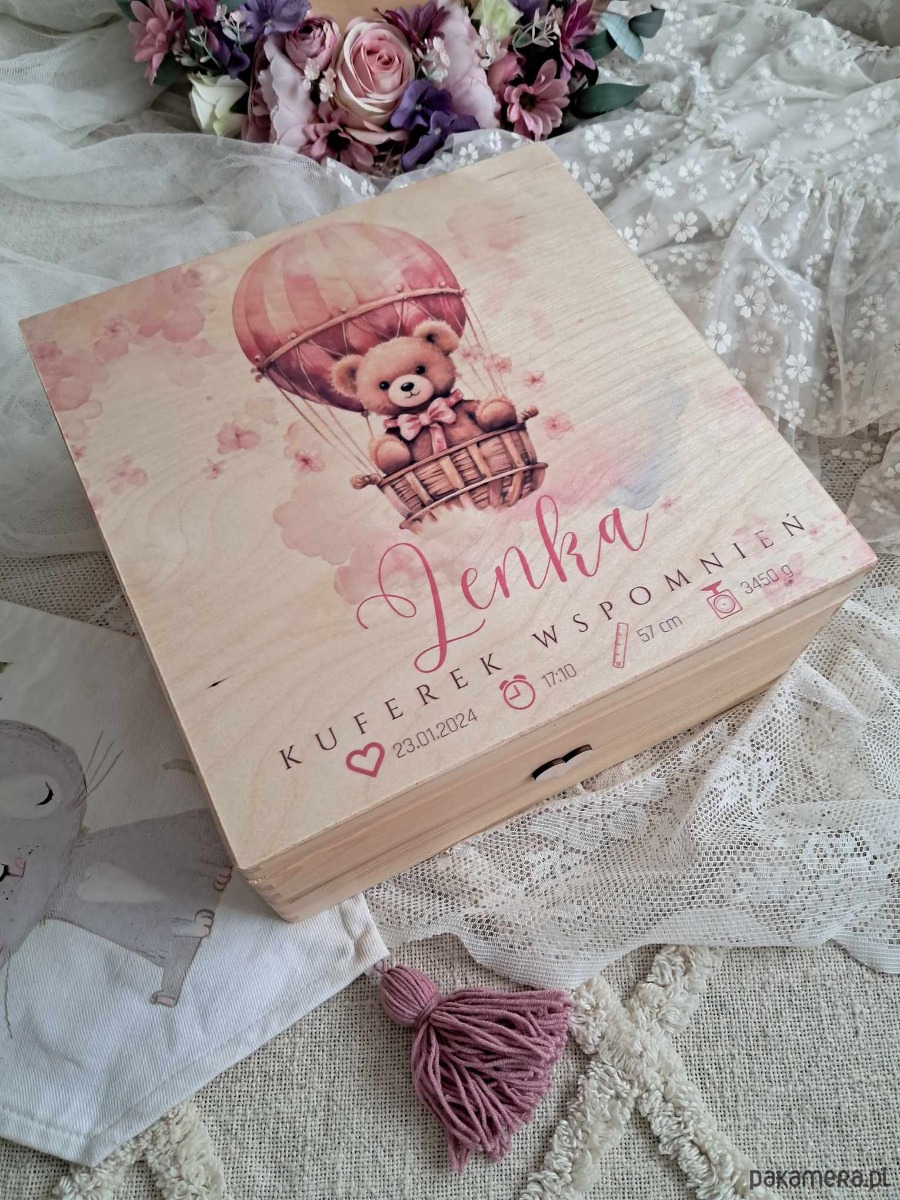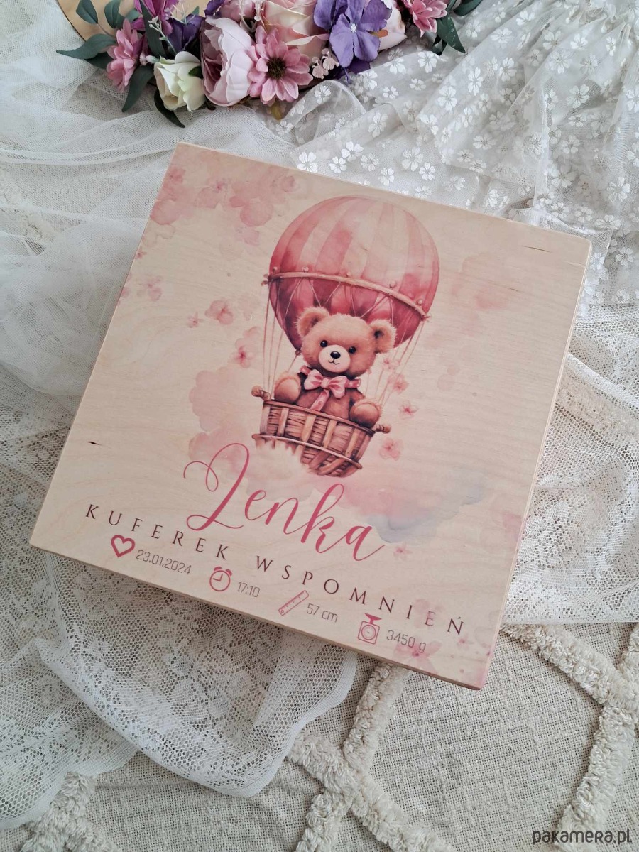 Przepiękny, personalizowany, drewniany kuferek dla dziewczynki. Słodka grafika misia w balonie, imię i metryczka urodzenia sprawią że kuferek stanie się czymś wyjątkowym.