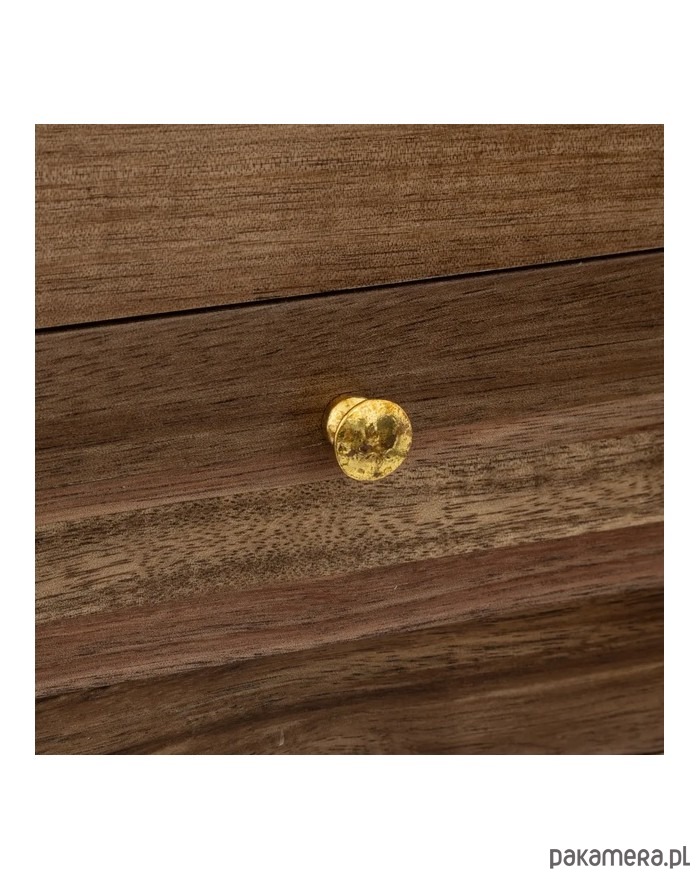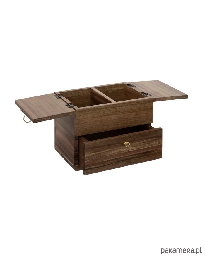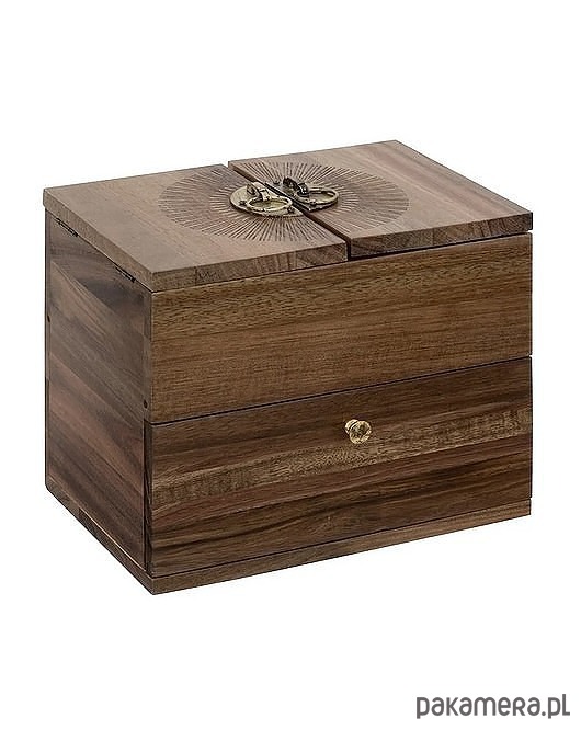 Piękny, bardzo oryginalny kuferek na biżuterię. Wykonany z drewna akacjowego. W kolorze ciemno-orzechowym. Posiada złote detale nawiązujące do stylu orientalnego.