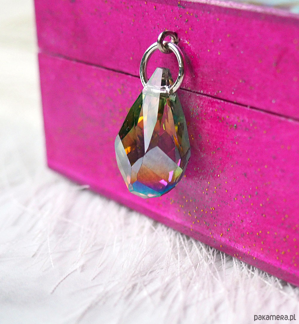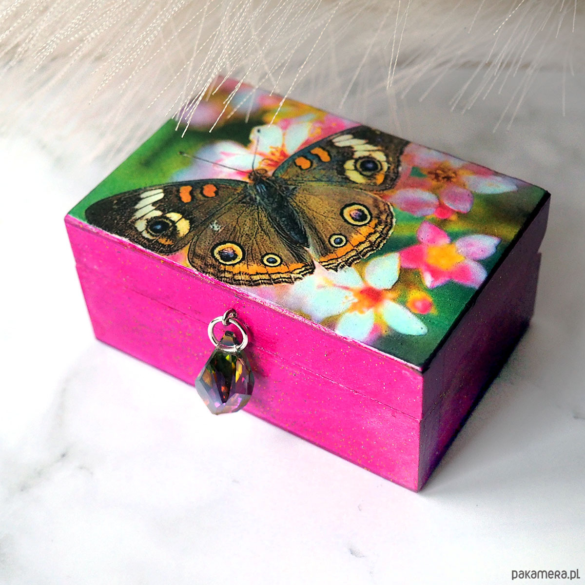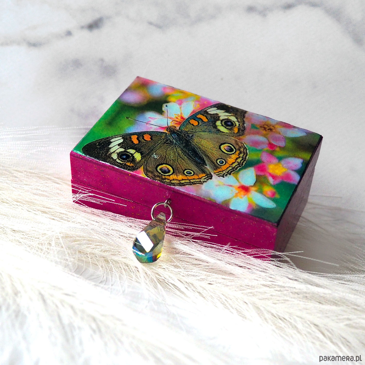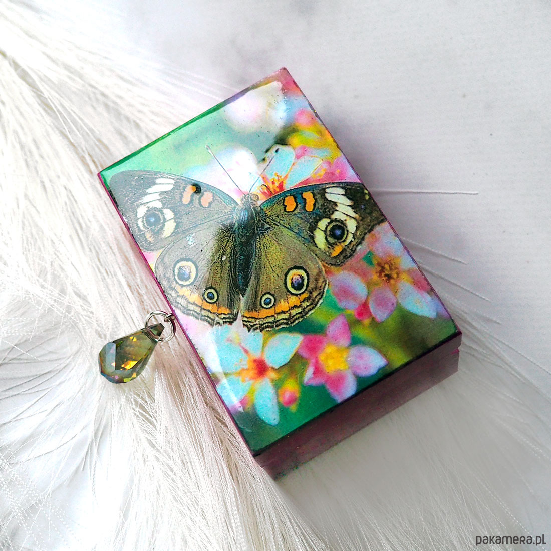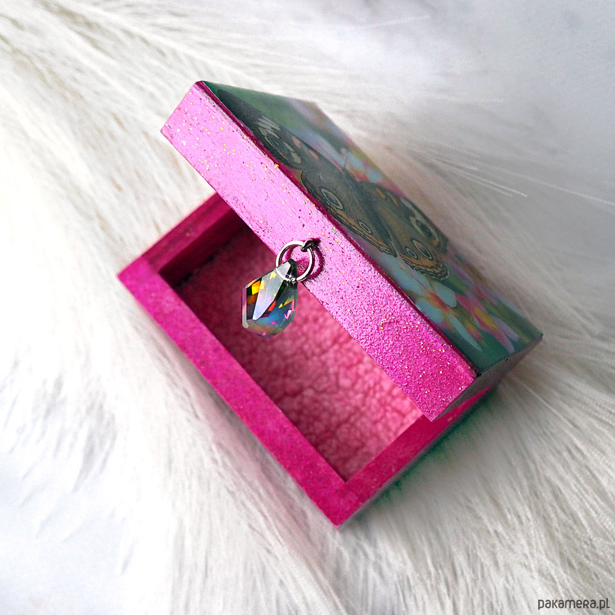 Urocza, mała, unikatowa, artystyczna ręcznie wykonana szkatułka z drewna sosnowego. Wieko z grafiką wtopioną w żywicę epoksydową. Wiszący uchwyt z pięknym, niesamowicie mieniącym się kryształem ( zdjęcie nie oddaje całego uroku). Wnętrze wyłożone puszystą tkaniną dla bezpieczeństwa przechowywanych tam klejnotów :) Boki i dno szkatułki polakierowana ekologicznym lakierem z połyskiem ze złotymi i zielonymi drobinkami (nie są zbyt widoczne na zdjęciu, trudno to uchwycić aparatem)