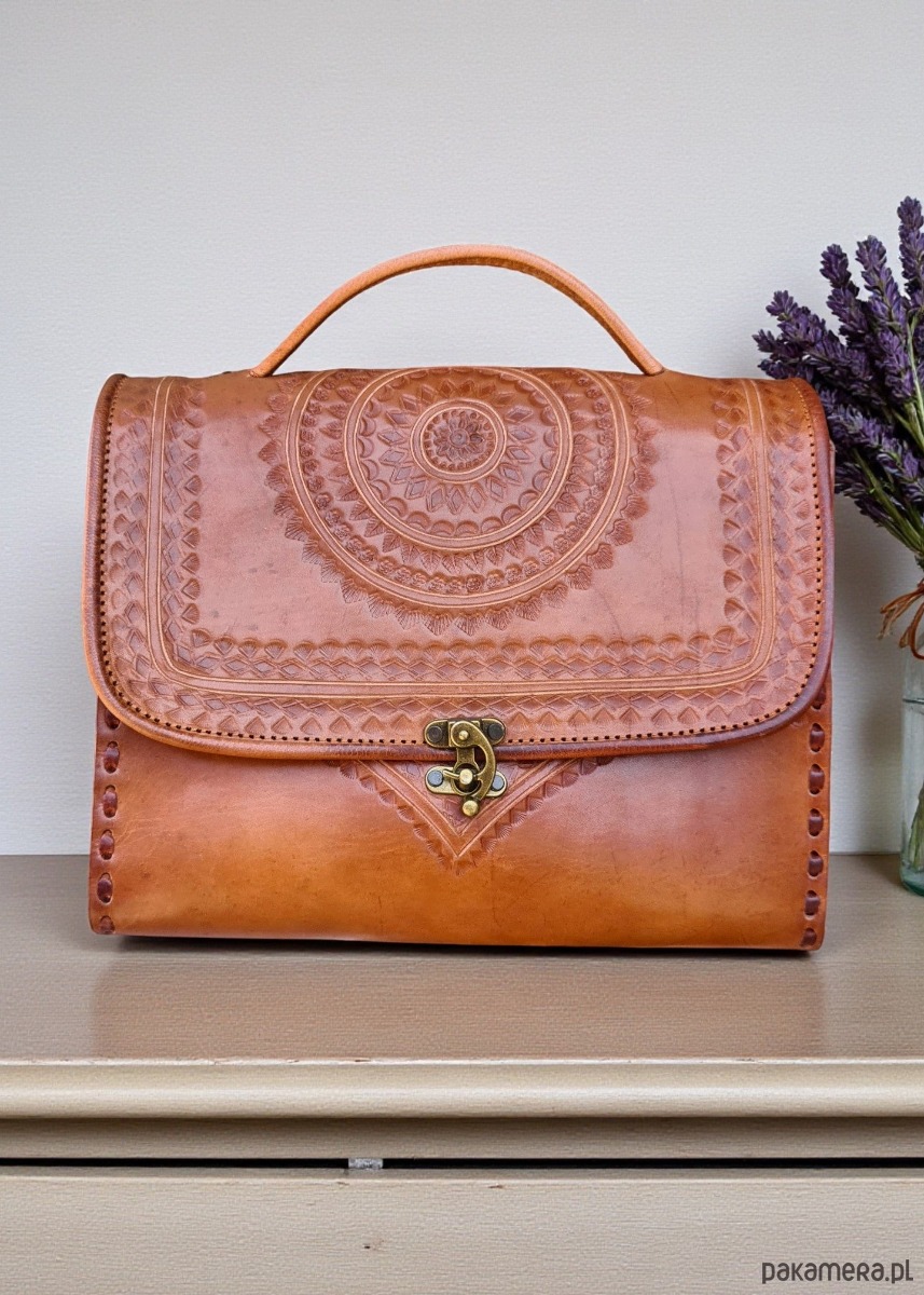 Ta ręcznie robiona torebka w kształcie kuferka emanuje luksusem i charakterem dzięki starannemu wykonaniu z wysokiej jakości skóry naturalnej. Jej solidna konstrukcja oraz precyzyjne detale, takie jak eleganckie metalowe zapięcie i ręcznie wybijane wzory, podkreślają jej wyjątkowy charakter. Dzięki starannej pracy naszych meksykańskich kaletników, każdy detal torebki jest dopracowany, co sprawia, że jest ona nie tylko praktyczna, ale także estetycznie zachwycająca. Wygodny uchwyt i regulowany pasek umożliwiają noszenie torebki zarówno w dłoni, jak i na ramieniu, sprawiając, że jest idealna na wiele różnych okazji, dodając szyku i elegancji każdej stylizacji. Dzięki unikatowemu designowi i wysokiej jakości wykonania, ta torebka z pewnością przyciągnie uwagę i będzie niezastąpionym dodatkiem do garderoby każdej kobiety, która ceni sobie klasykę i styl.