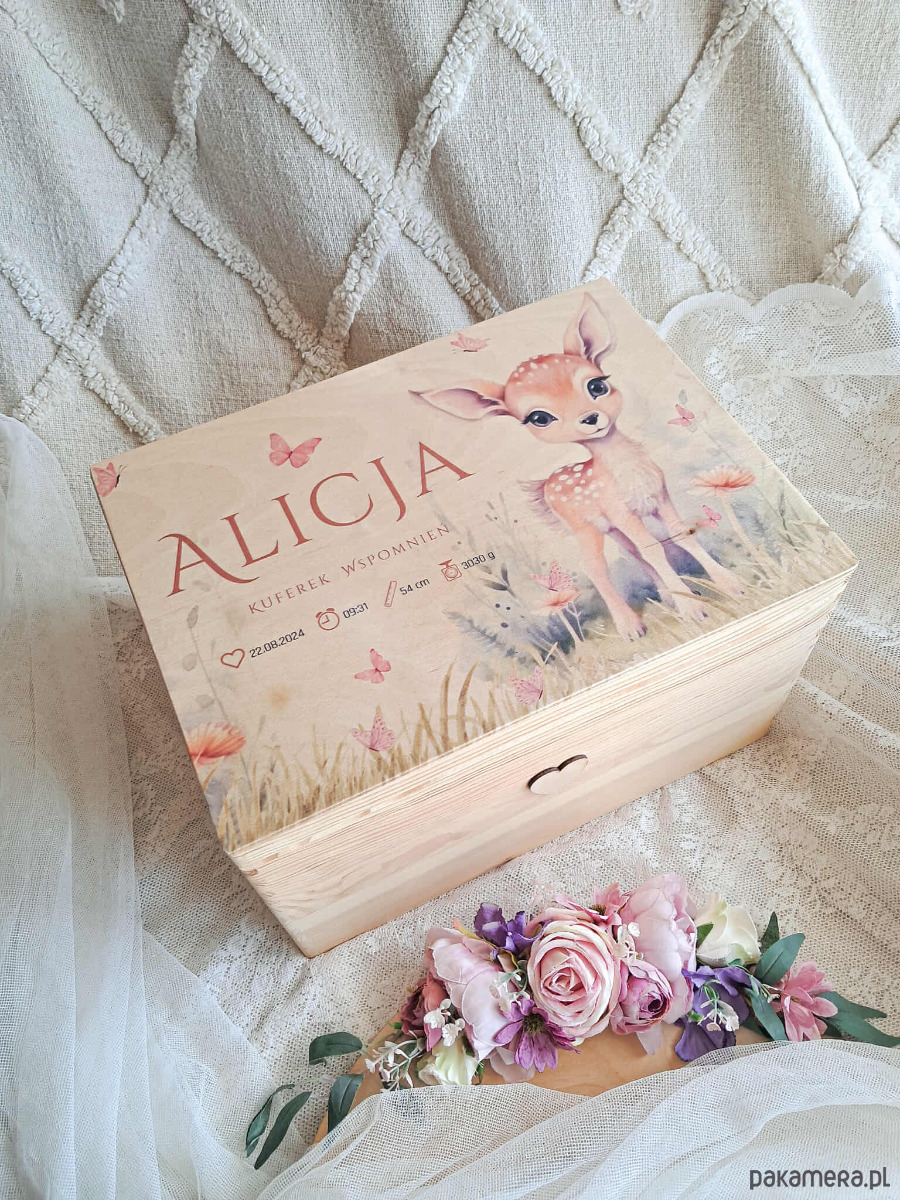 Szukasz prezentu, który będzie zarówno piękny, jak i praktyczny? Ten drewniany kuferek wspomnień z motywem sarenki to idealne rozwiązanie! Wykonany z solidnego drewna, pomieści wszystkie skarby Twojego malucha, chroniąc je przed kurzem i zniszczeniem. Uroczy motyw przypadnie do gustu miłośniczce zwierząt, a personalizacja imieniem sprawi, że kuferek stanie się wyjątkowym elementem wystroju pokoju. To nie tylko praktyczne pudełko na pamiątki, ale także piękna dekoracja, która wprowadzi do wnętrza radosną atmosferę.