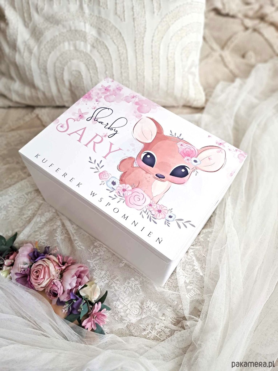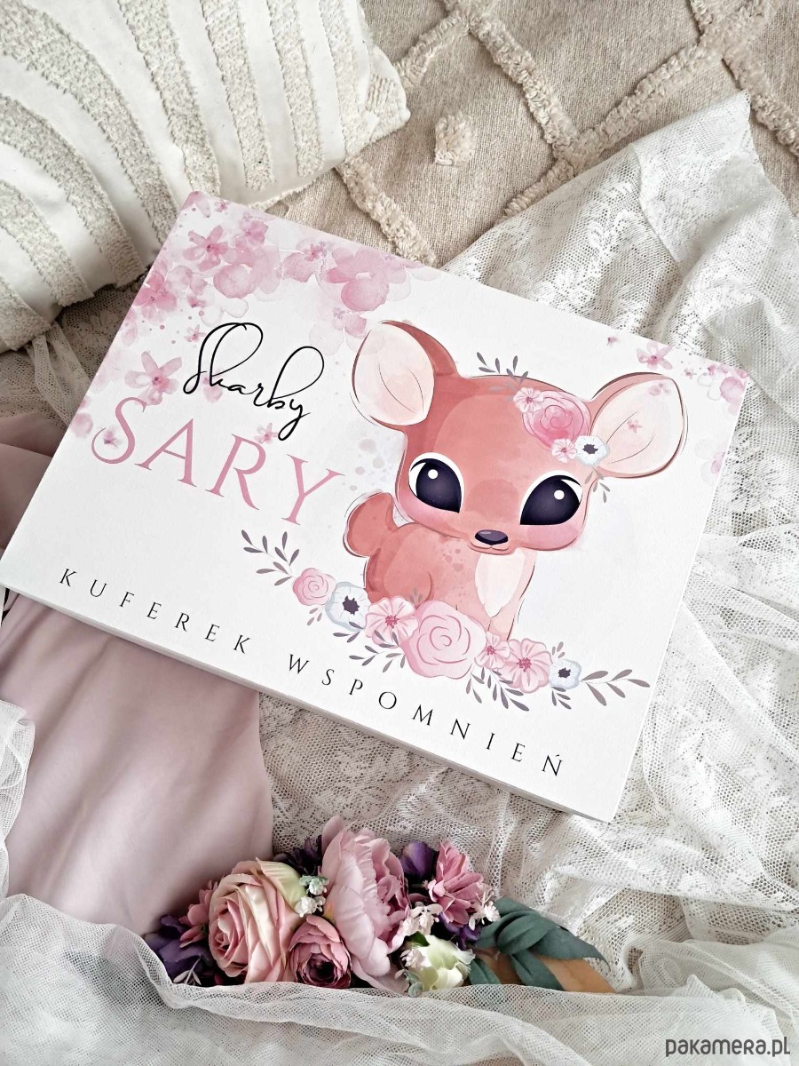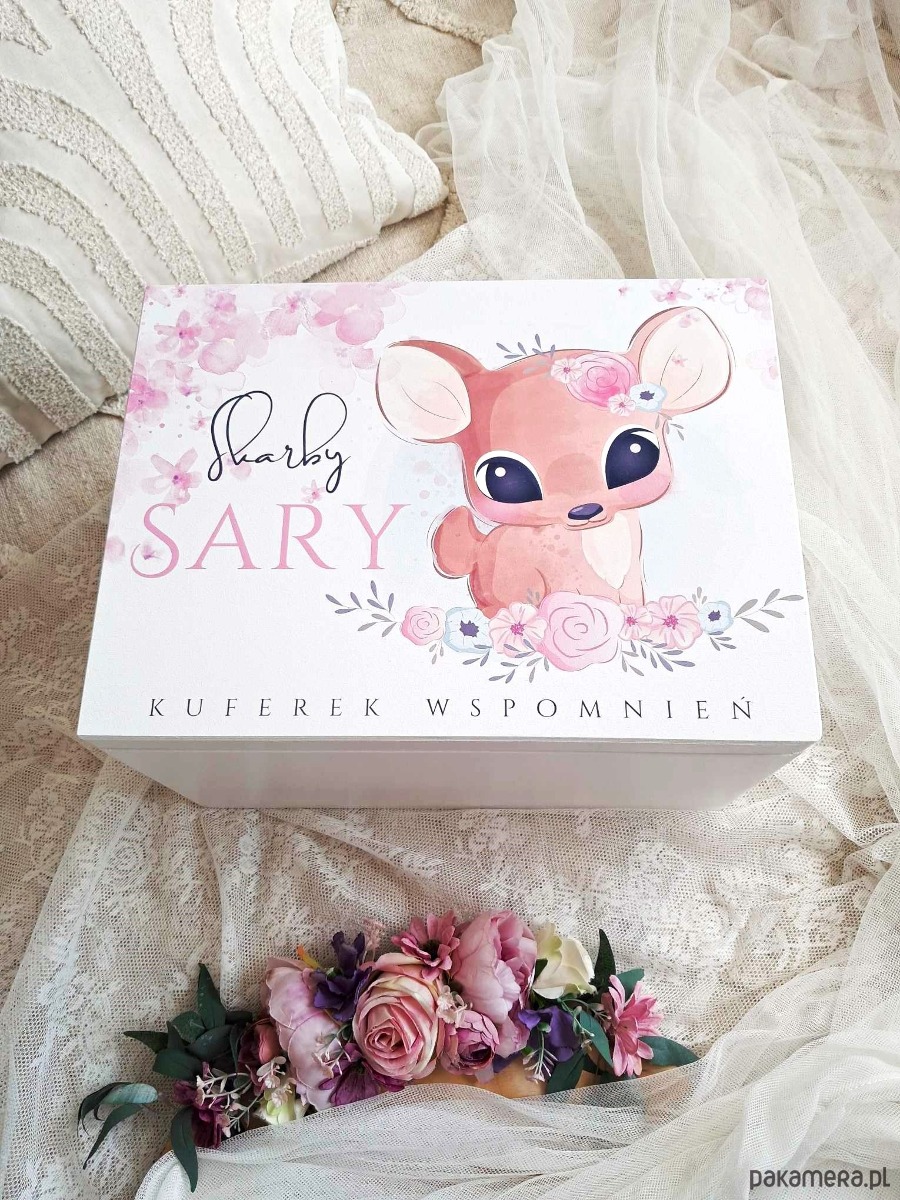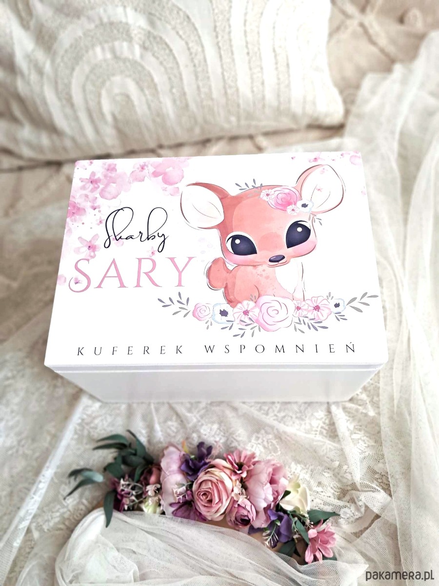 Szukasz wyjątkowego prezentu, który stanie się niezapomnianą pamiątką? Poznaj naszą personalizowany kuferek z uroczą grafiką Sarenki i delikatnymi kwiecistymi detalami. Ten elegancki kuferek idealnie nadaje się jako prezent na narodziny dziecka, chrzest, roczek czy urodziny.