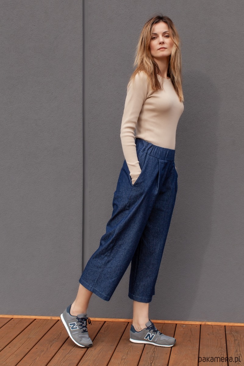 Spodnie o szerokiej nogawce sięgającej do połowy łydki. Wykonane są z miękkiego cienkiego jeansu 100% bawełna. W pasie mają gumę, z przodu zakładki, a z boku wszyty zamek.
