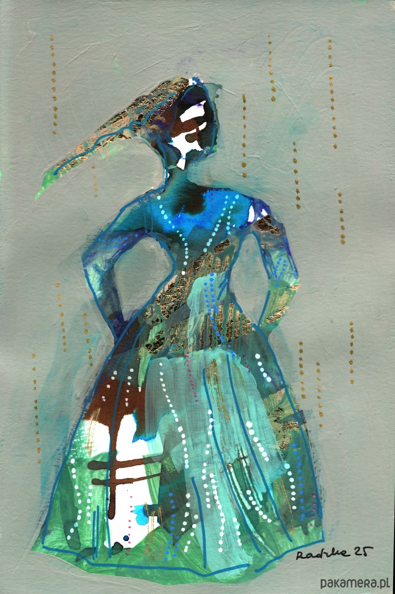 Akwarela formatu 16x24 cm wykonana za pomocą akwareli Talensa, złotych płatków szlagmetalu, z dodatkiem tuszu, akryli oraz kaligraficznych pisaków Kuretake na profesjonalnym papierze akwarelowym Talens 300 g/m2.
