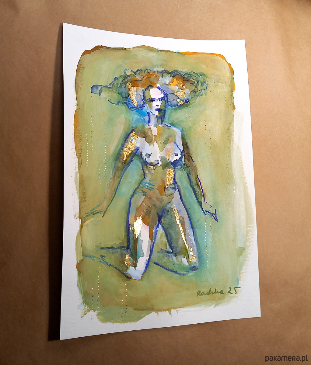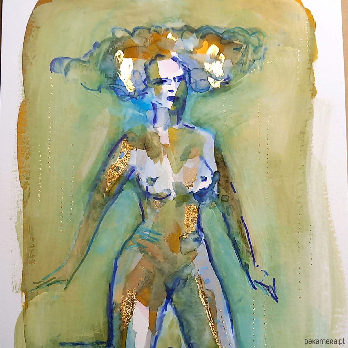Akwarela formatu 16x24 cm wykonana za pomocą akwareli Talensa, złotych płatków szlagmetalu, z dodatkiem tuszu, akryli oraz kaligraficznych pisaków na profesjonalnym papierze akwarelowym Talens 300 g/m2.